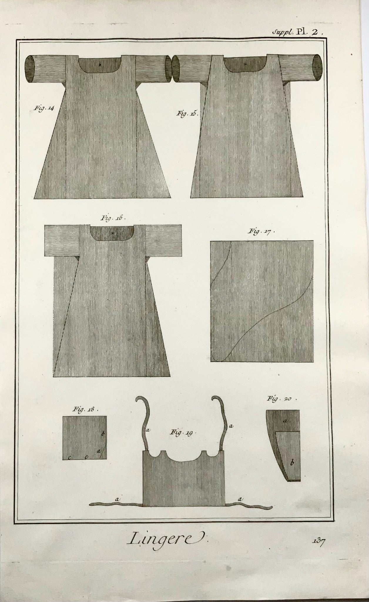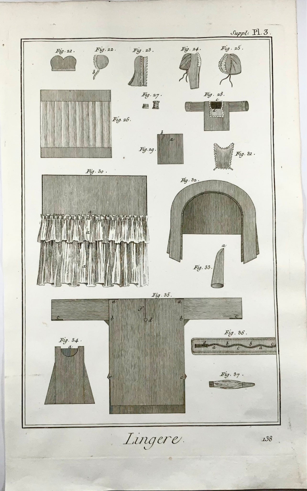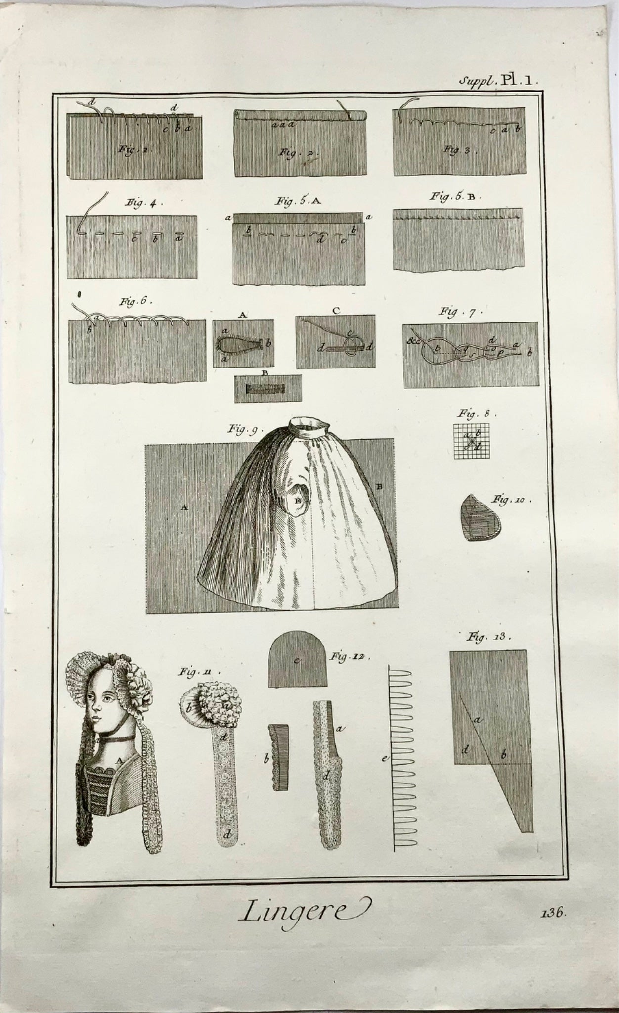 Four beautiful pages of original engravings, published in 1771 in Denis Diderot's important work "Encyclopedie" and entitled :"Lingere" or Lingerie being the complete set of Supplementary Plates 1 to 4, illustrating nightwear, bonnets, stitching, patterns and embroidery.