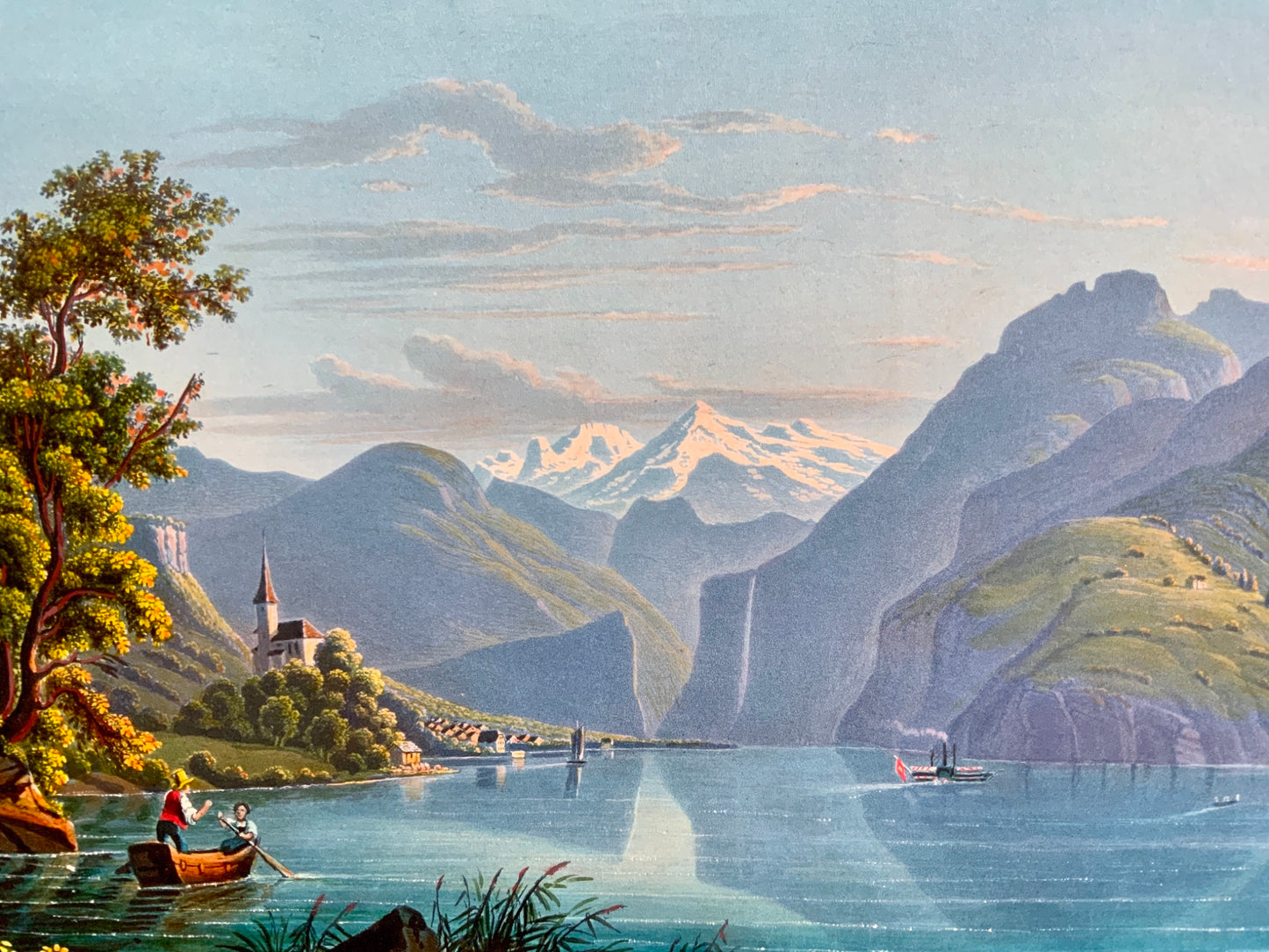 Depicts a Paddle Steam Ship on the Brienzersee with the town of Brienzersee and the Jungfrau Mountain as a backdrop.
