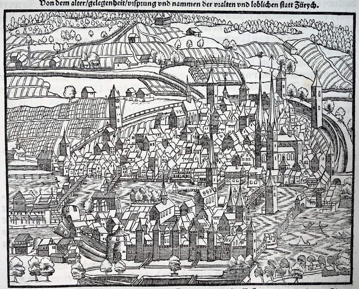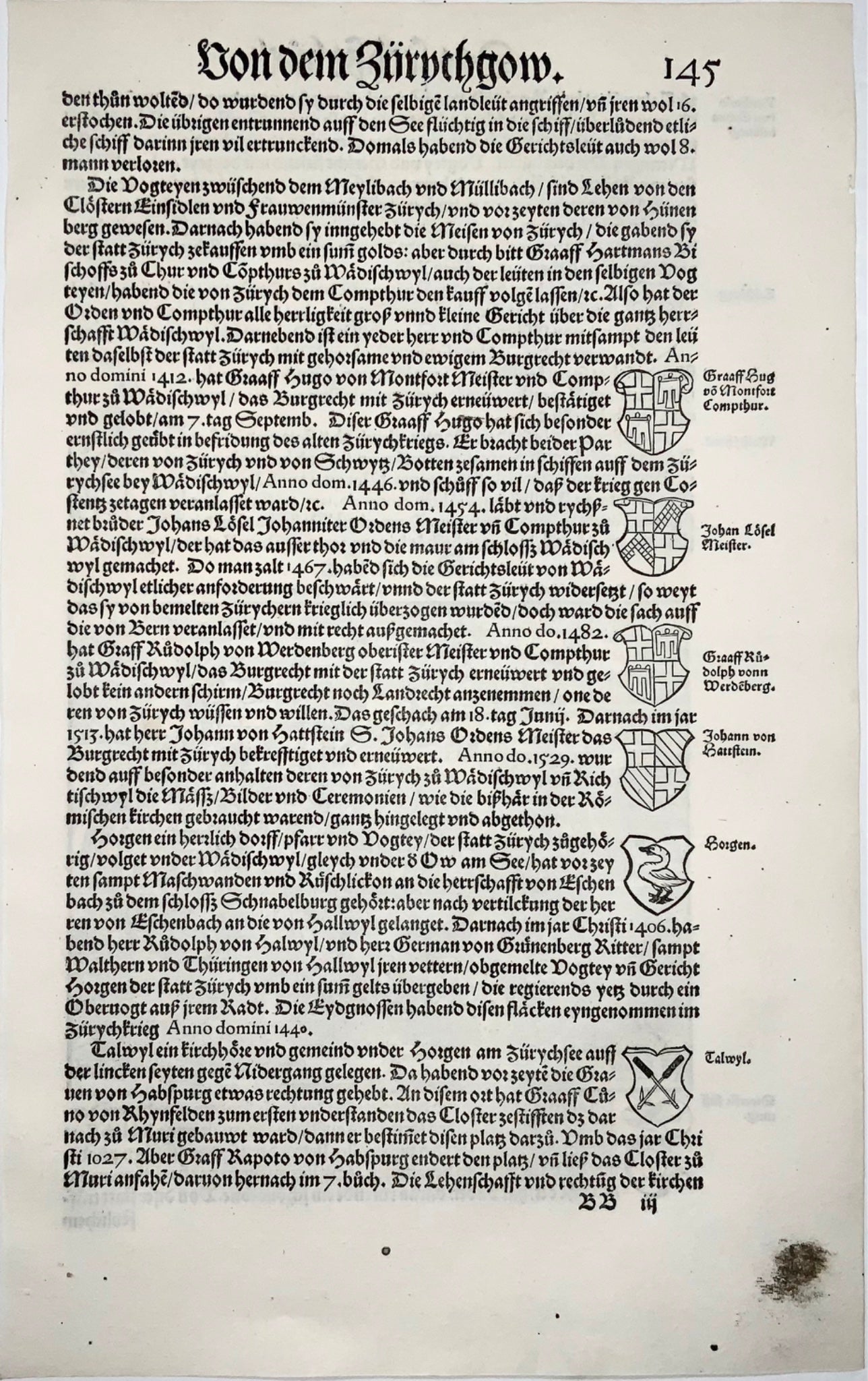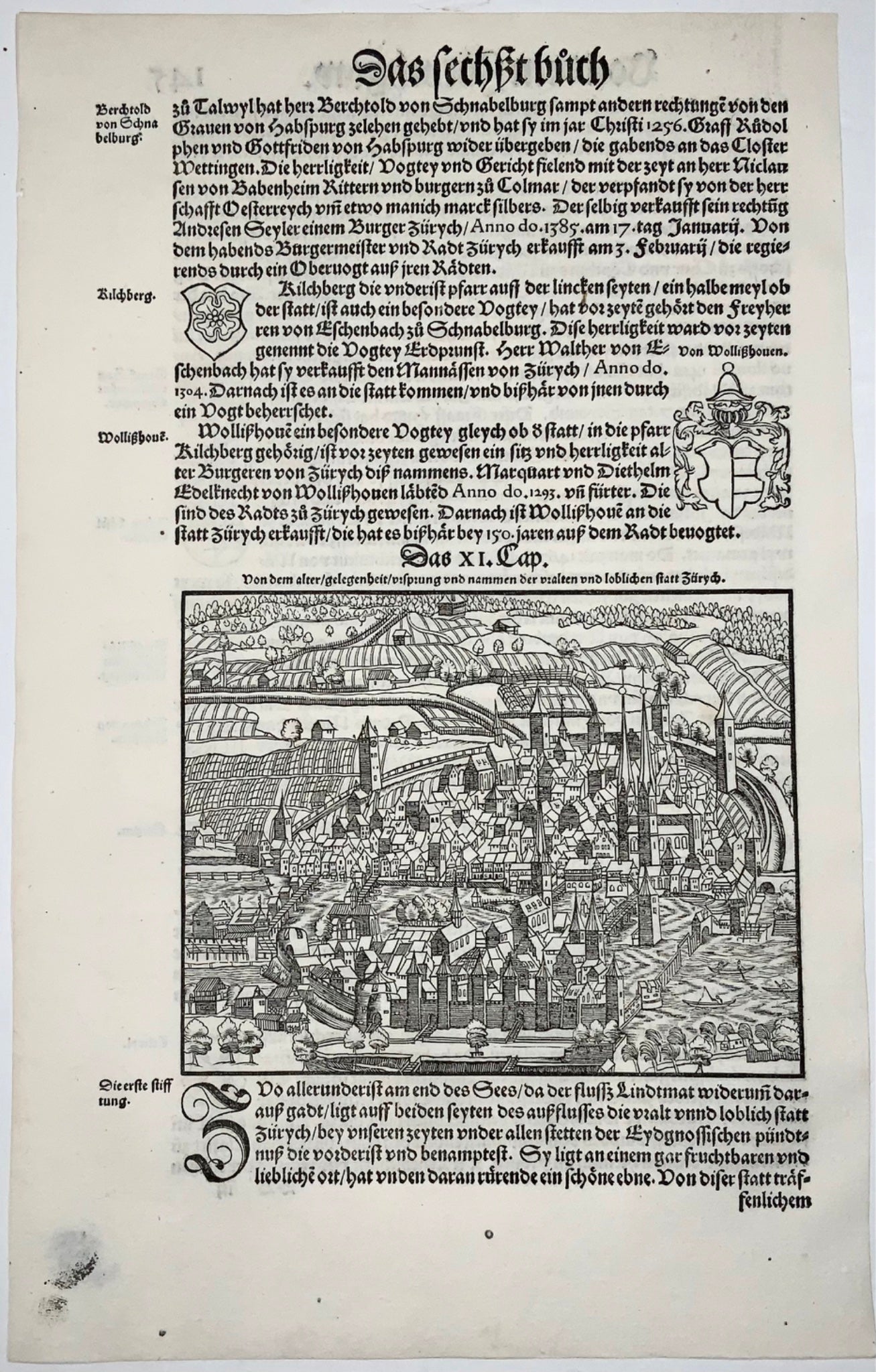 Original woodcut leaf from the scarce first issue of Stumpfs ‘Schweizer Chronik’ of 1548.