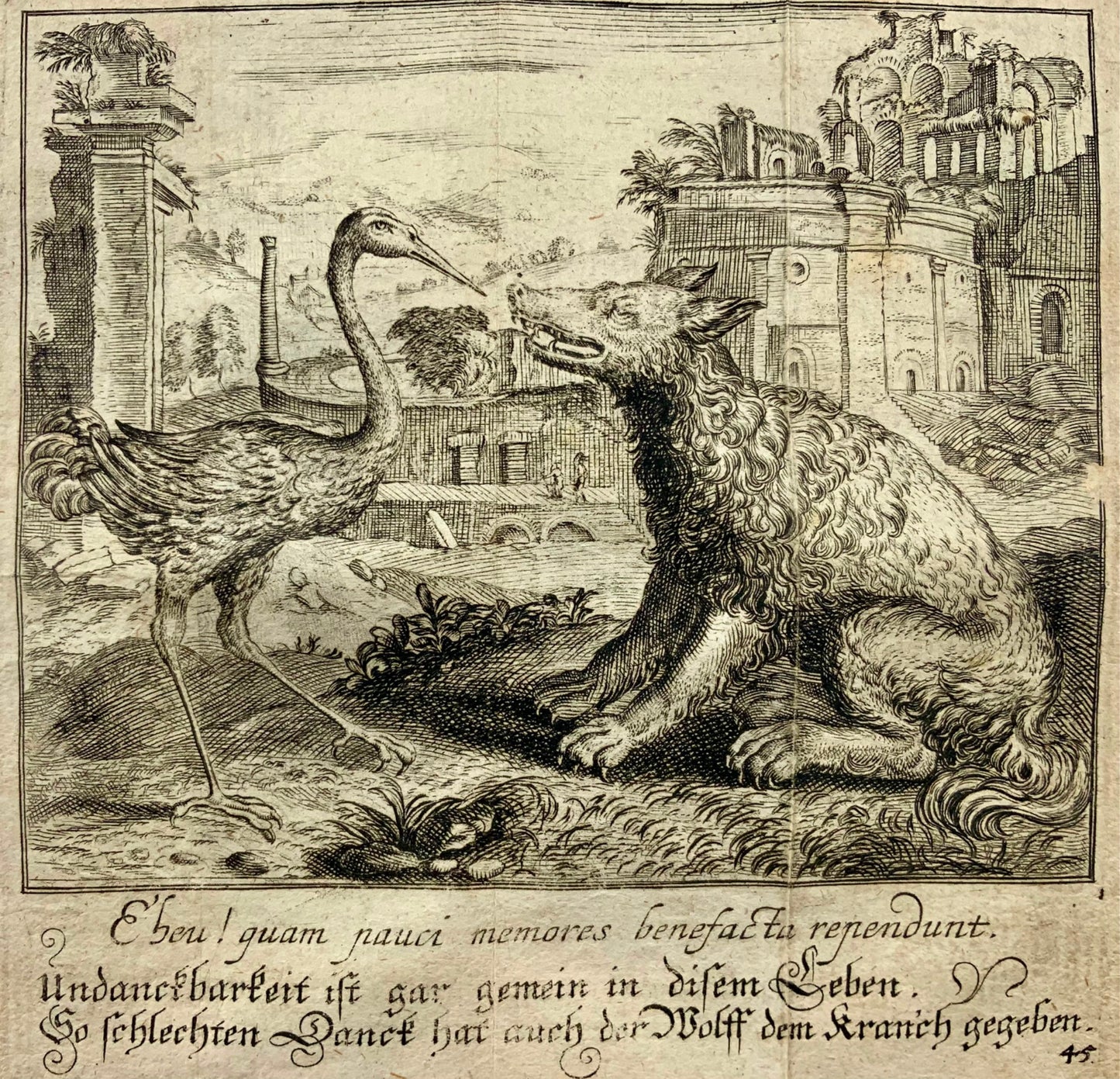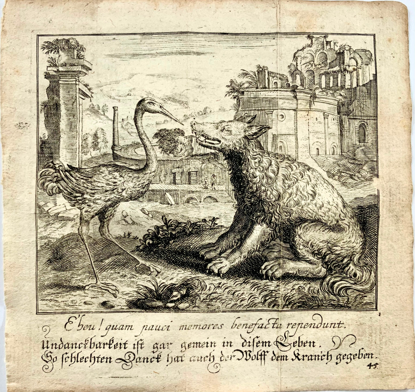 1689 Sadeler, Schmidts, emblem engraving, The Crane and the Wolf, Aesop