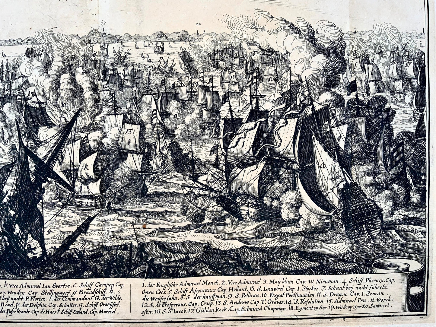 The scene depicts the Dutch fleet under Maarten Tromp engrossed in heavy battle with the English fleet under George Monck. Although Tromp was killed early in the battle, his death was kept secret to keep up the morale of the Dutch. A legend along the bottom lists the commanders and ships marked on the view.