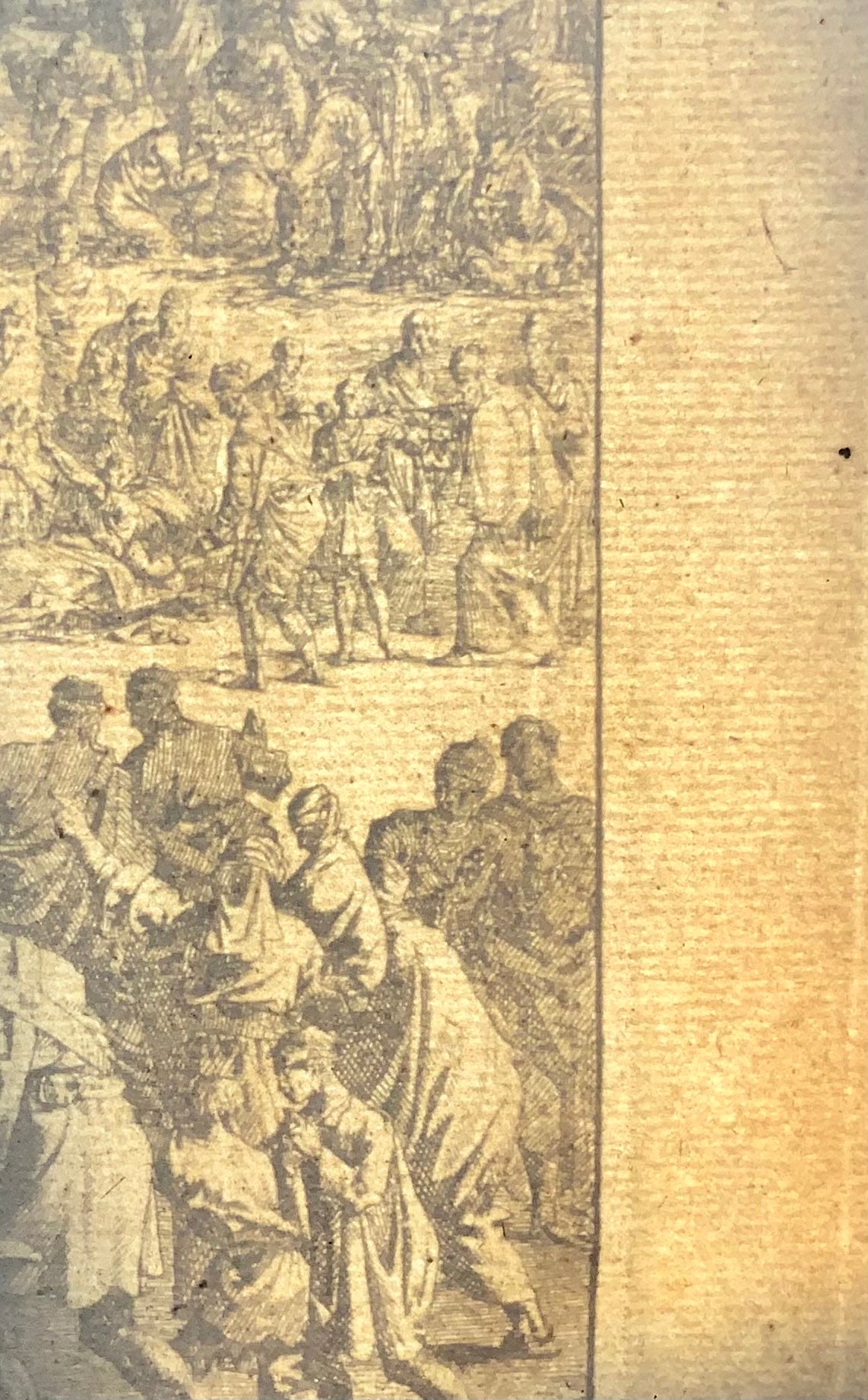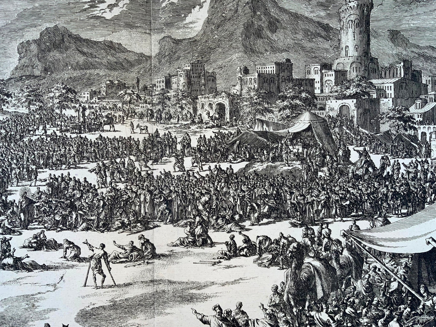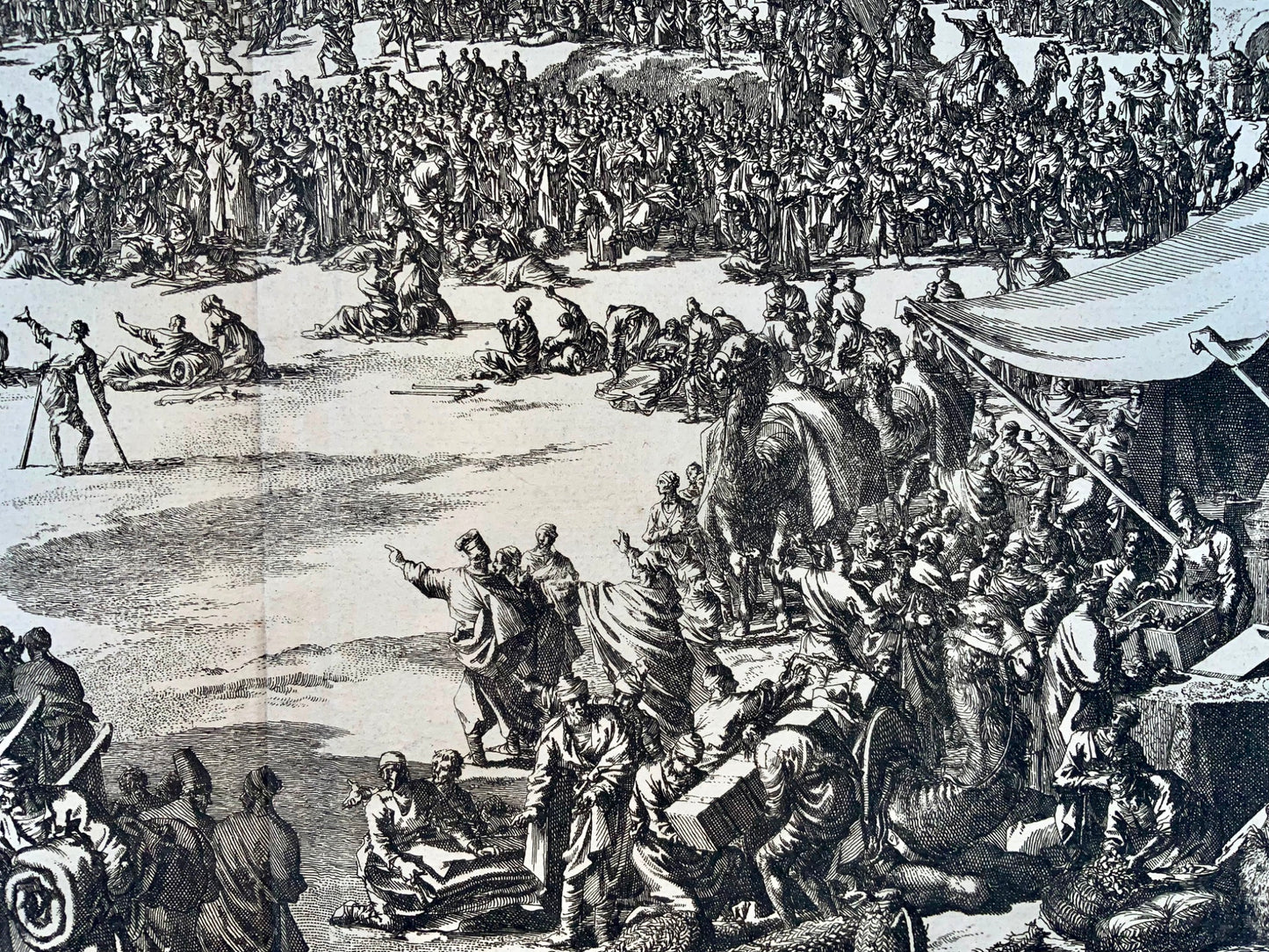 Fine engraving issued by Pieter Mortier (1661–1711) in 1708. This impression is from either the 1729 or the 1743 edition published by Jan Covens (1697–1774) and Corneille Mortier (fl.1688–c1743) in “Biblia Sacra, dat is, de H. Schriftuer van het Oude, en het Nieuwe Testament, naer de laetste Roomsche keure der gemeine Latijnsche overzettinge, in nederduitsch vertaeld (...)”.