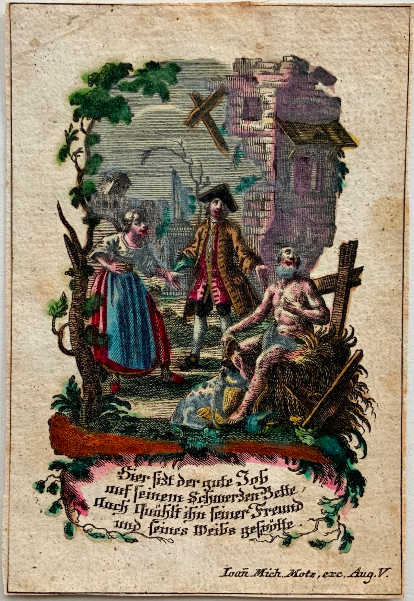 1730 GOOD JOB rare devotional card by Johann Michael Motz, hand coloured