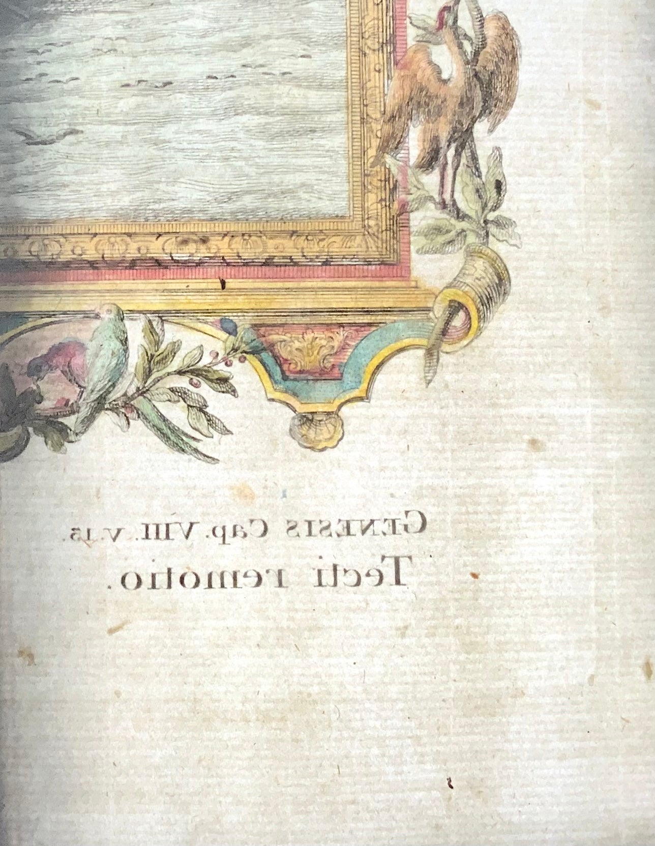 This fascinating folio engraving is from Johann Jakob Scheuchzer’s Physica Sacra. The work was published in Augsburg und Ulm between 1731 and 1735. Each engraving features highly decorative borders which feature biblical and scientific depictions.