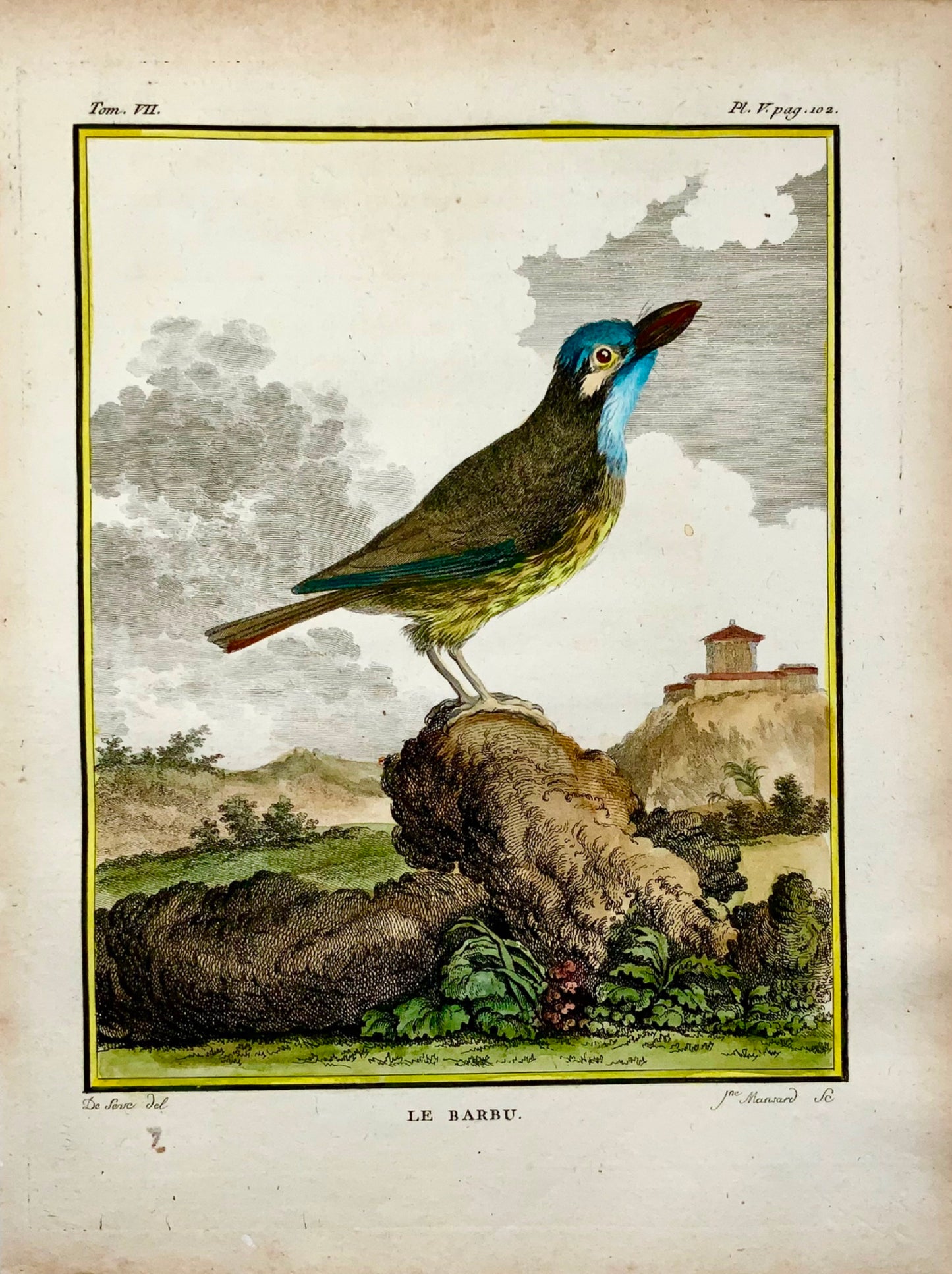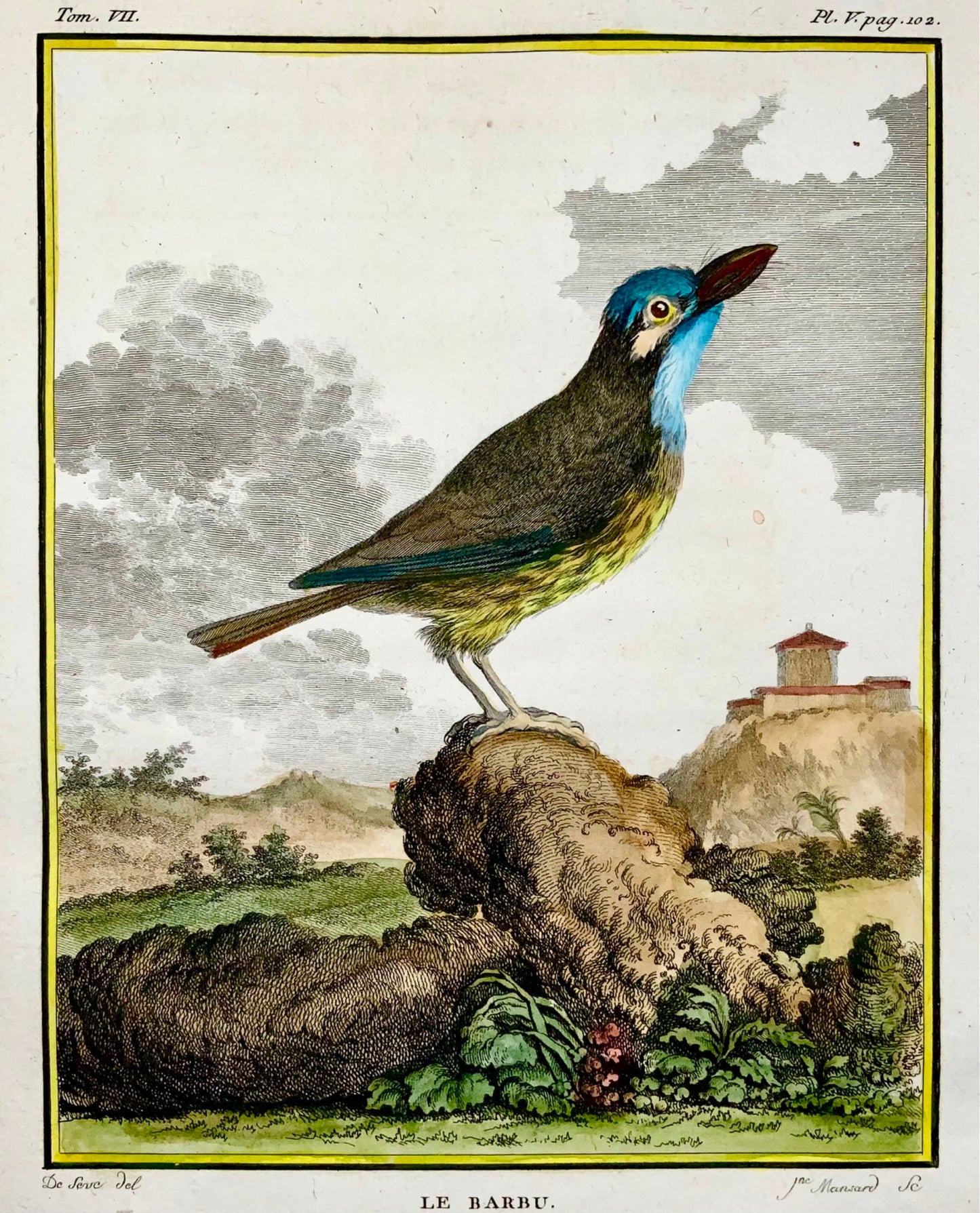 1779 de Seve, Barbet, ornithology, 4to large edition, hand coloured engraving