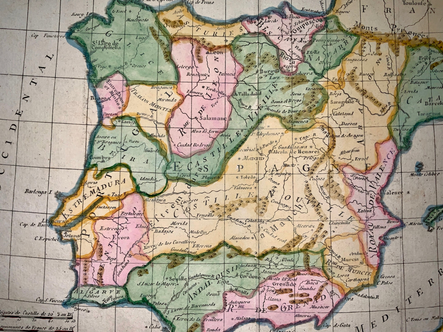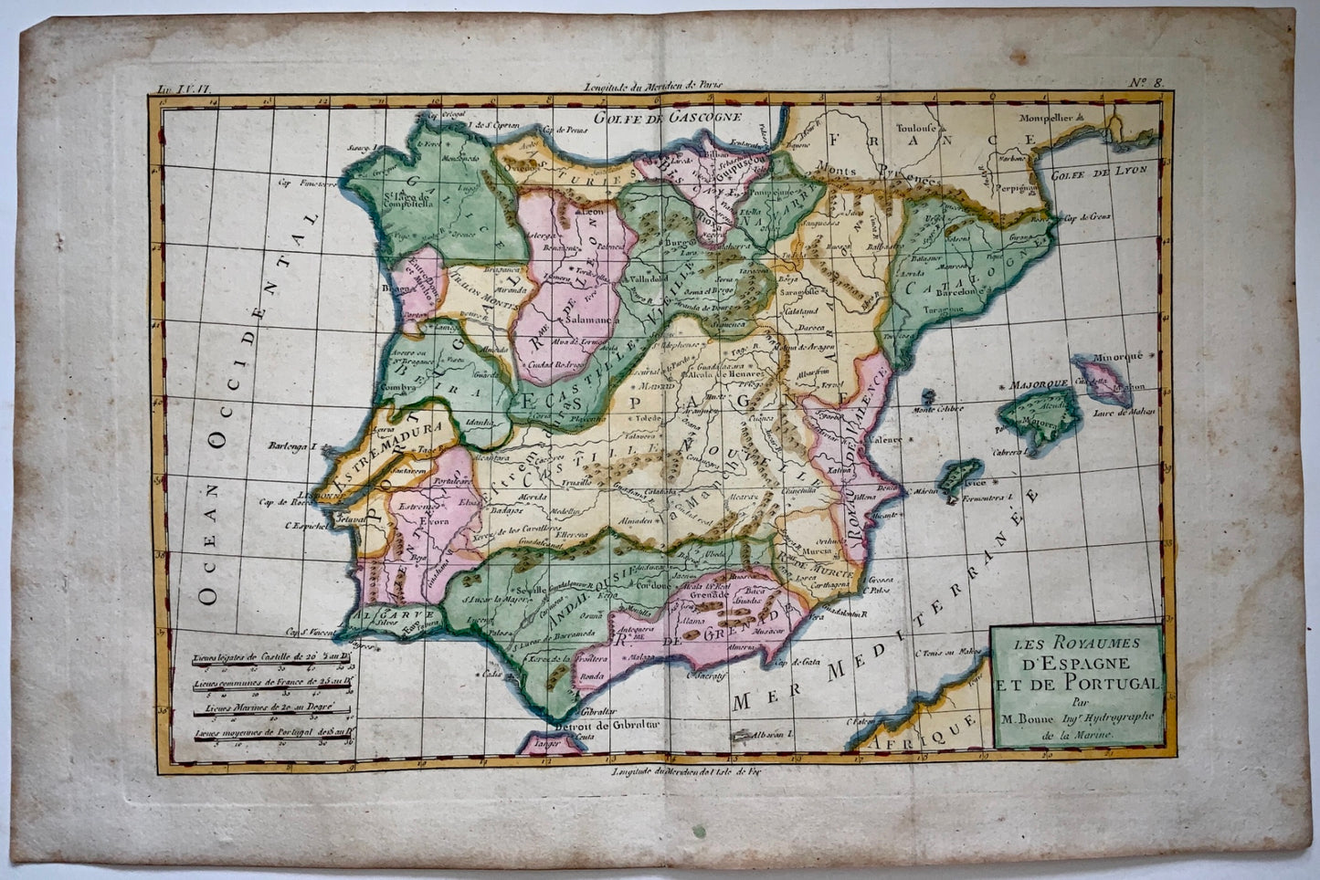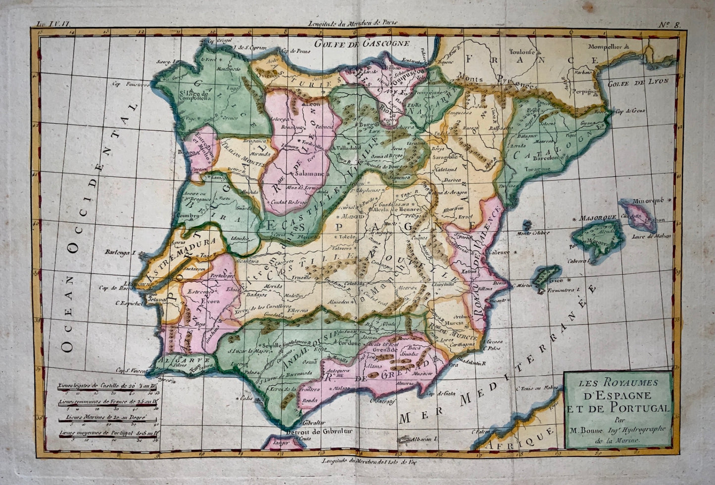 1780 Bonne - Spain & Portugal - hand coloured engraved map