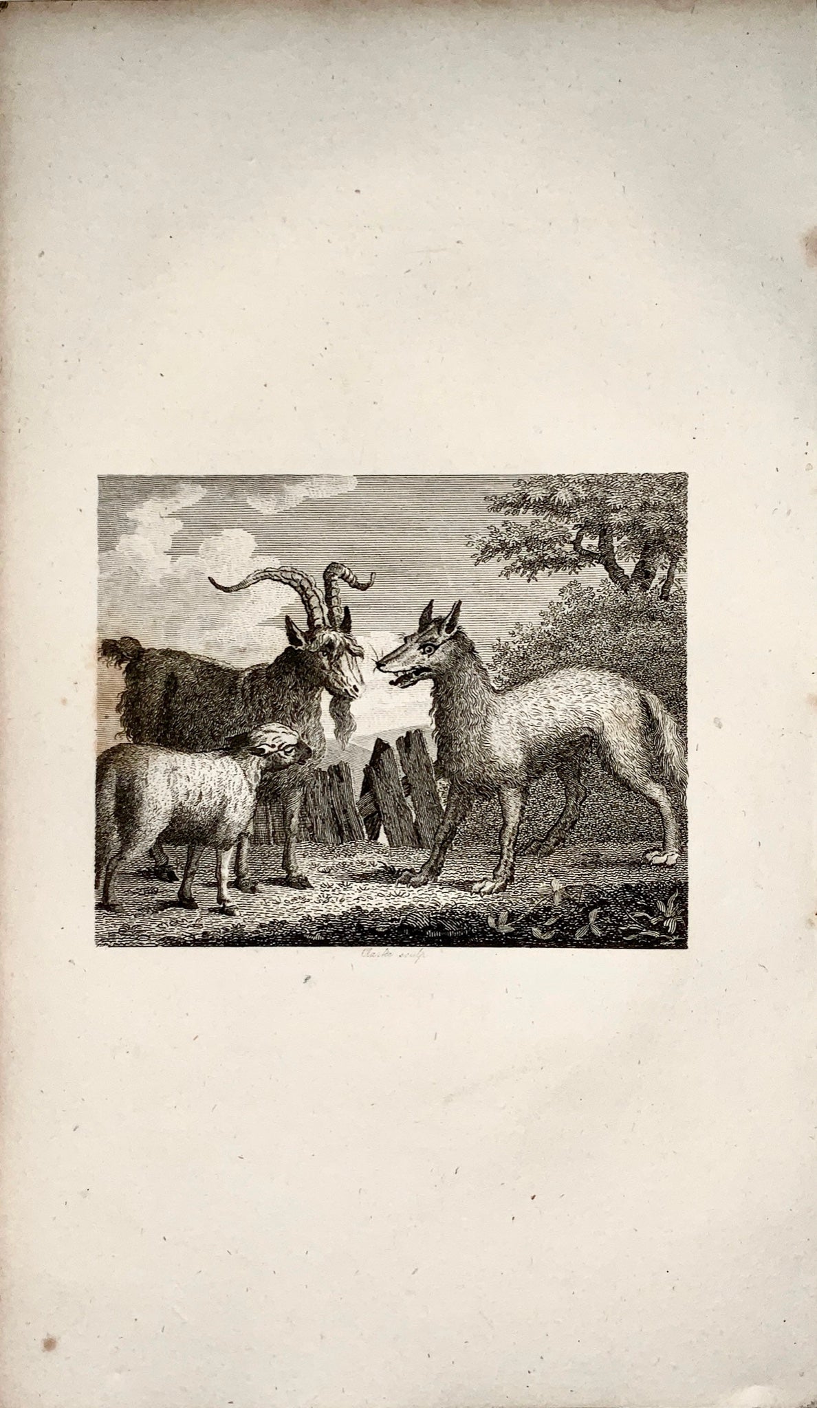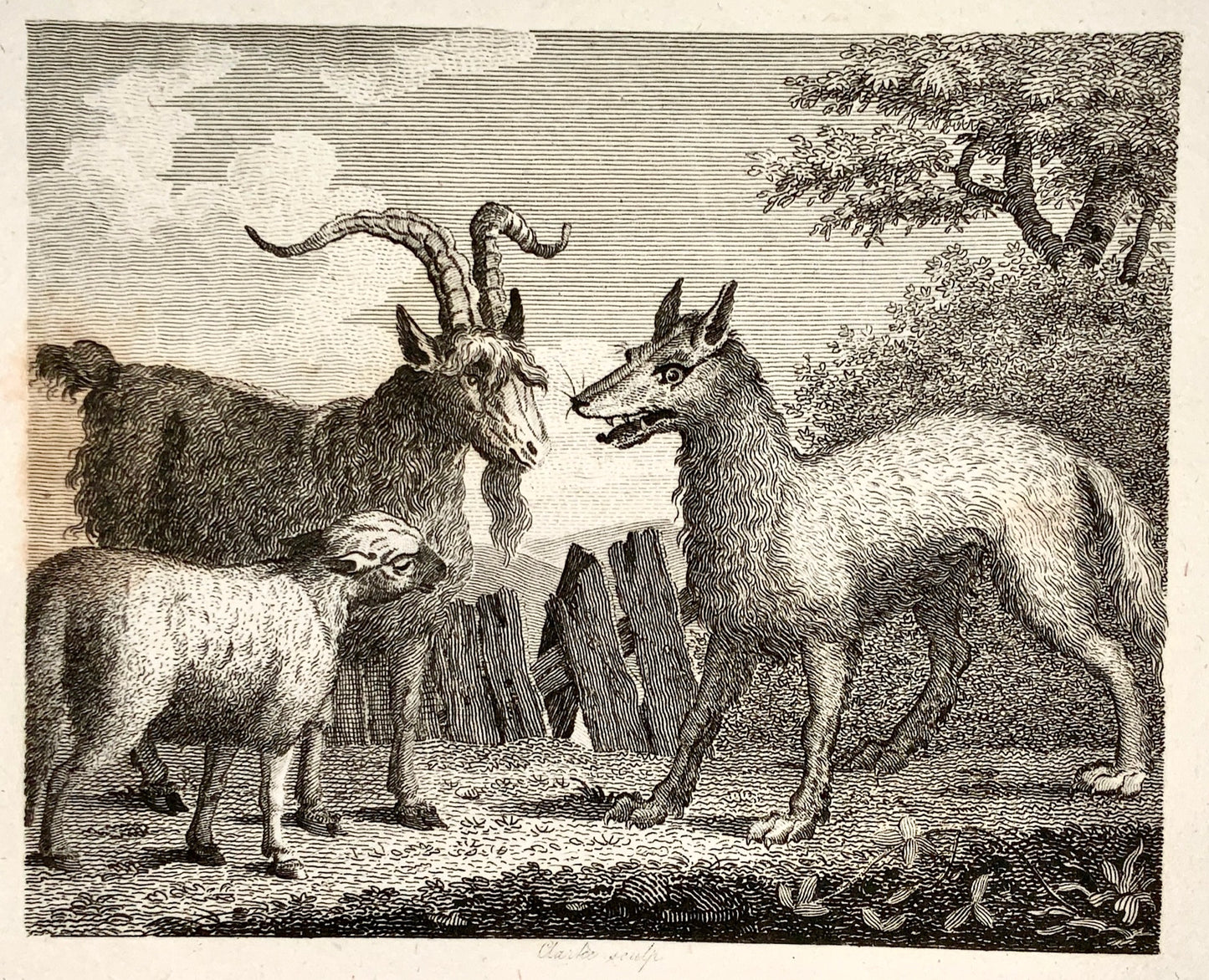 1780 c. Clarke, sculp. - The Wolf, Lamb & the Goat - copper engraving - Fable, Aesop