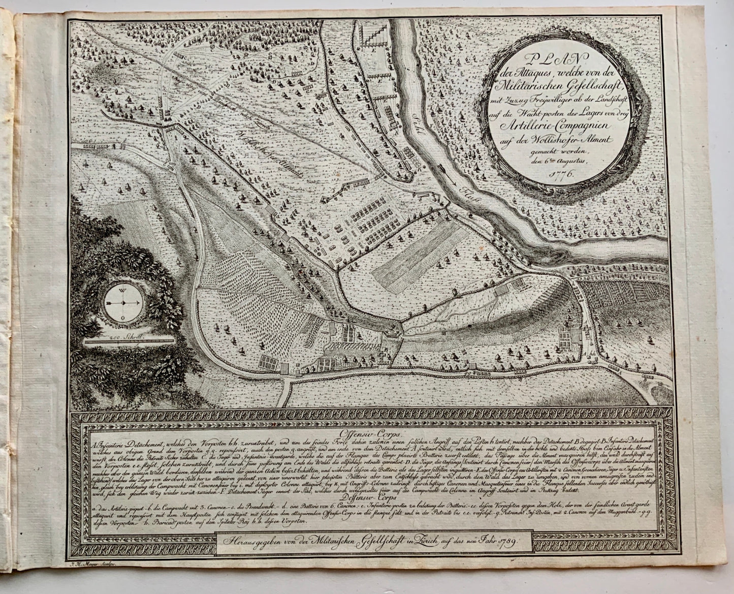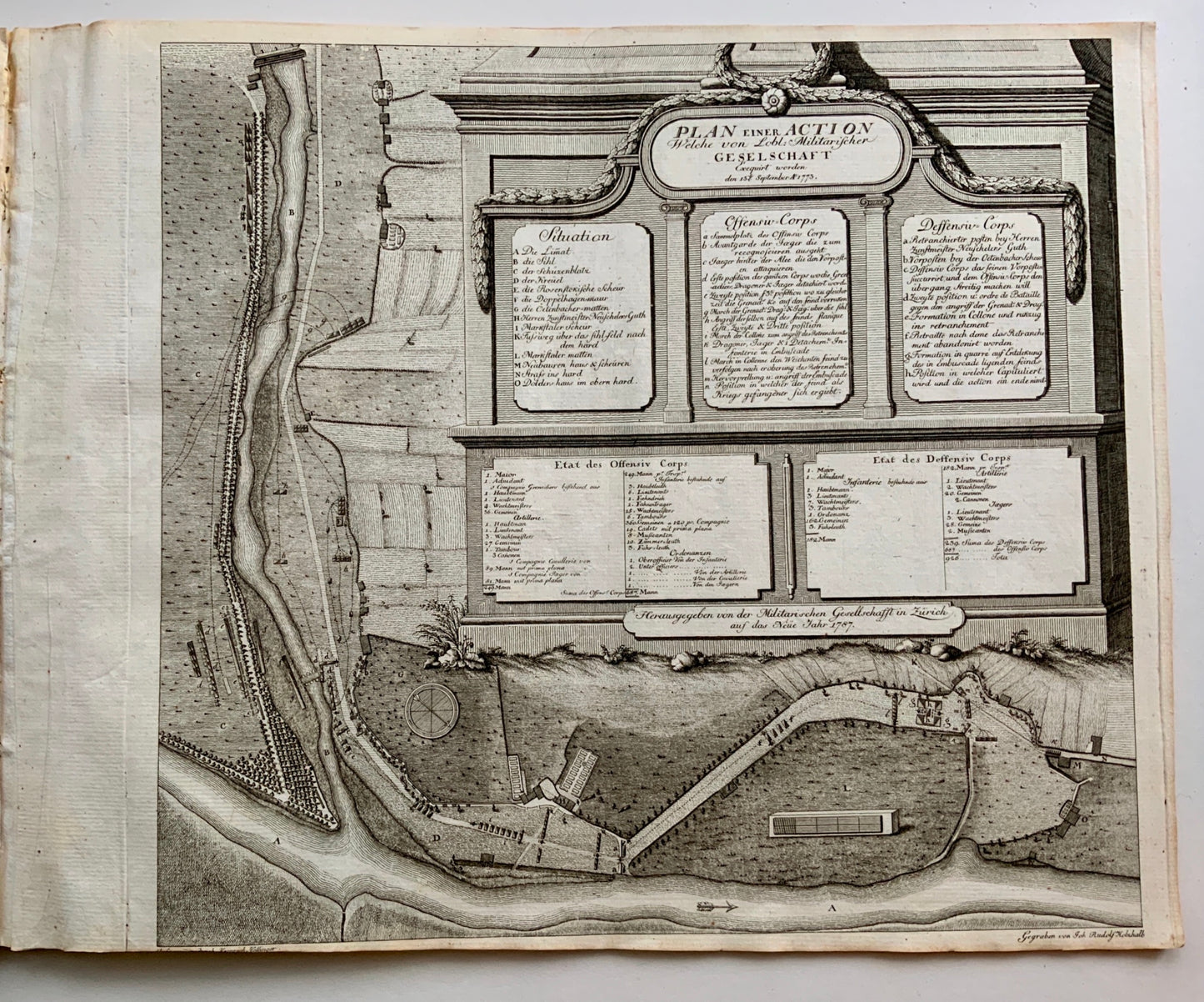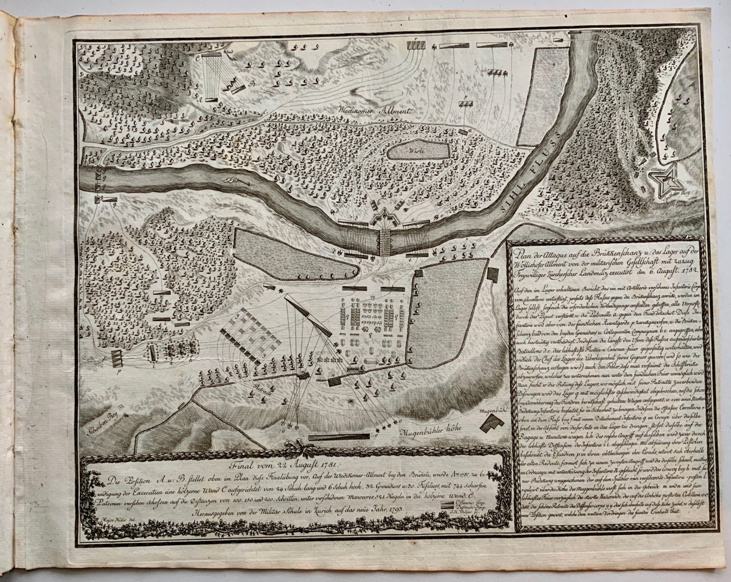 Sammlung derjenigen Final-Exercitien welche von der militärischen Gesellschaft in Zürich theils durch sich selbst, theils mit freywilligen Zuzügern ab der Landschaft vollführt worden / herausgegeben von der militärischen Gesellschaft auf das neue Jahr 1784. Kupfertitel u. 14 Kupfertafeln.