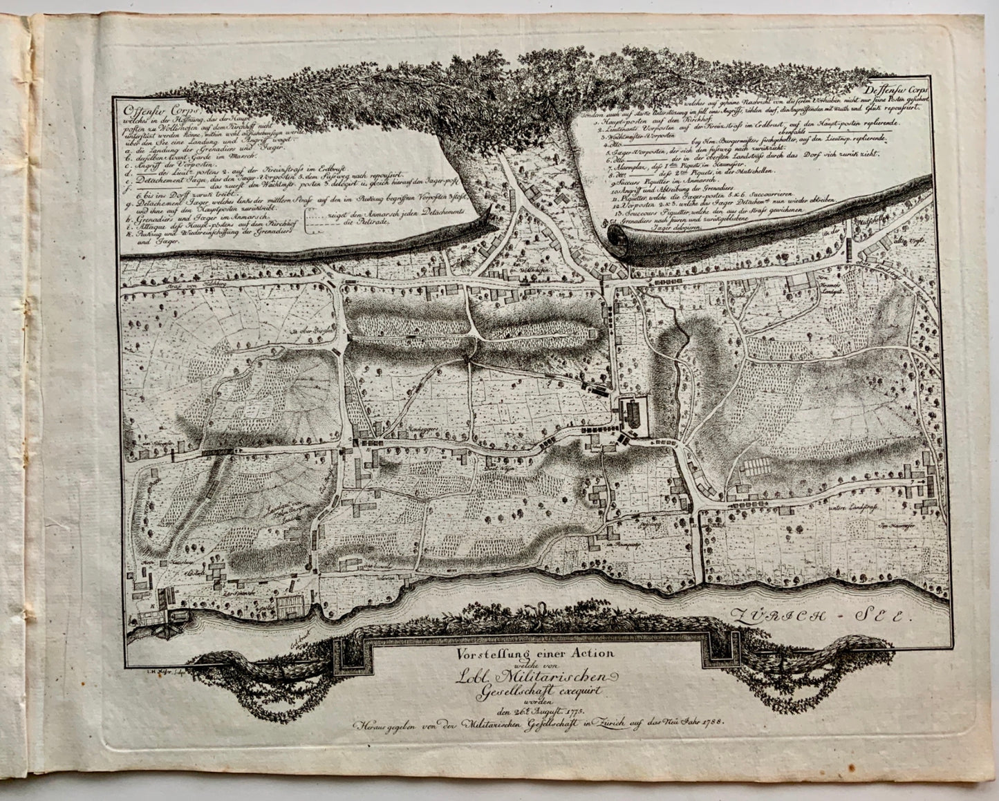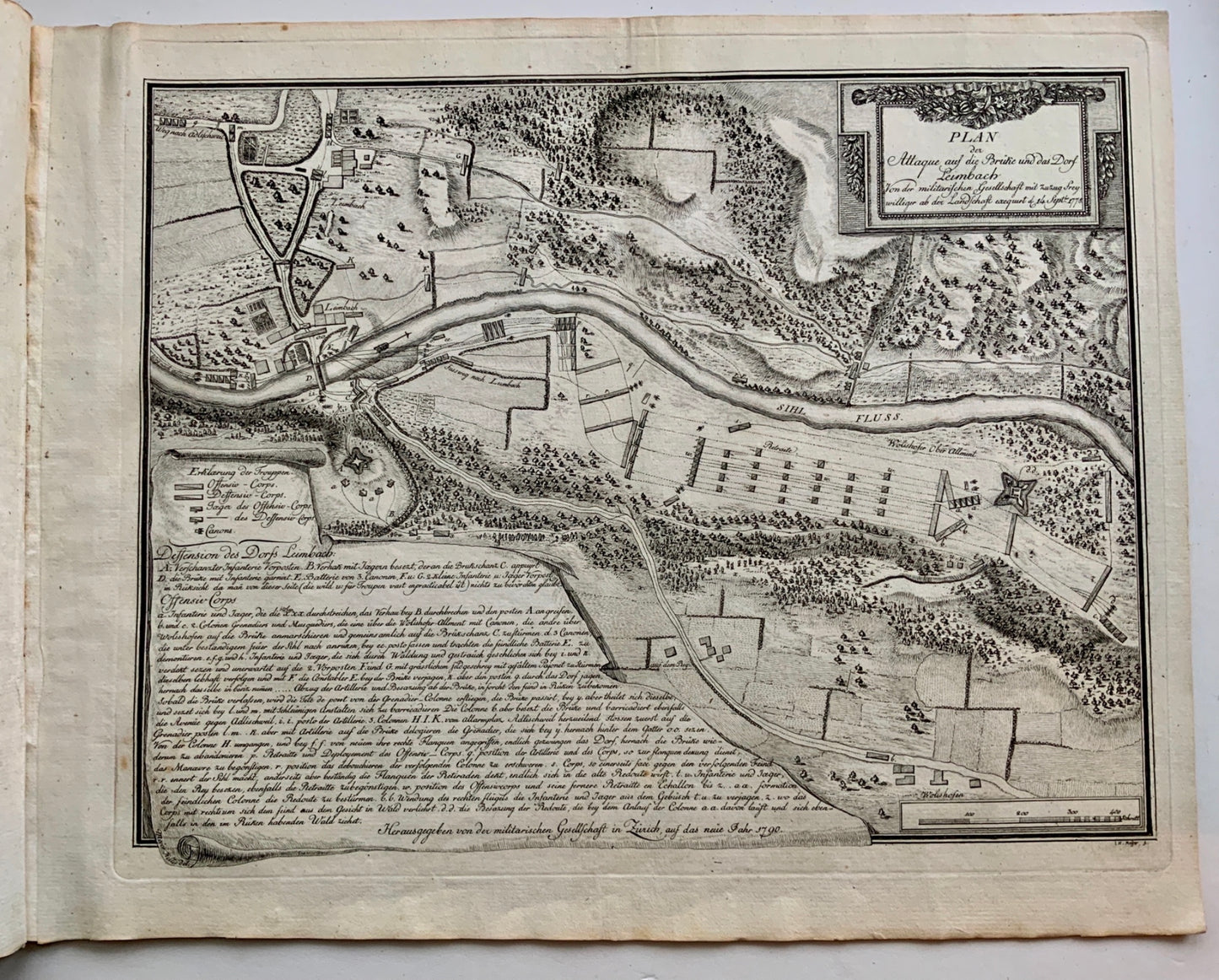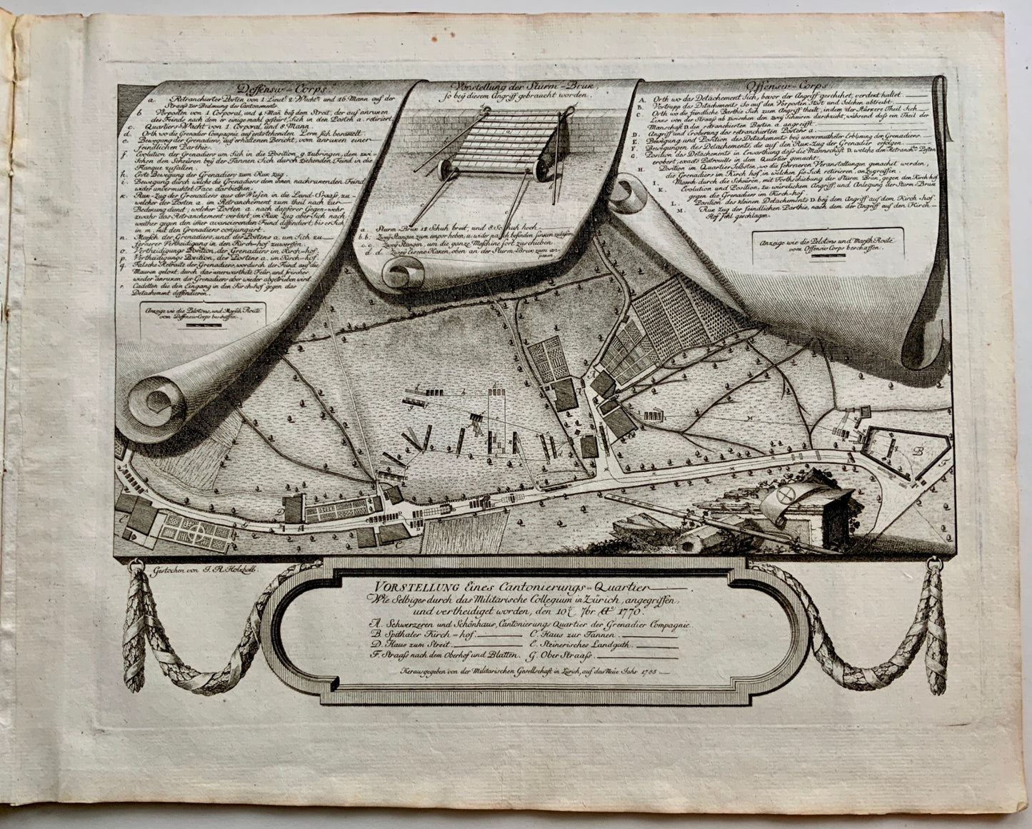 "Zurich's second military company at that time set itself the task of training a powerful basic troop through regular exercises. The revolutionary year 1798 brought the sequence to a standstill in connection with military operations. They partly provide information about the appearance of individual parts of the city and the surrounding landscapes at the time. With engraved verses and explanations. " (Pipe). The sheets in large folio were used for technical artillery training.
