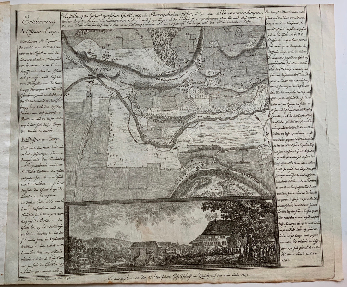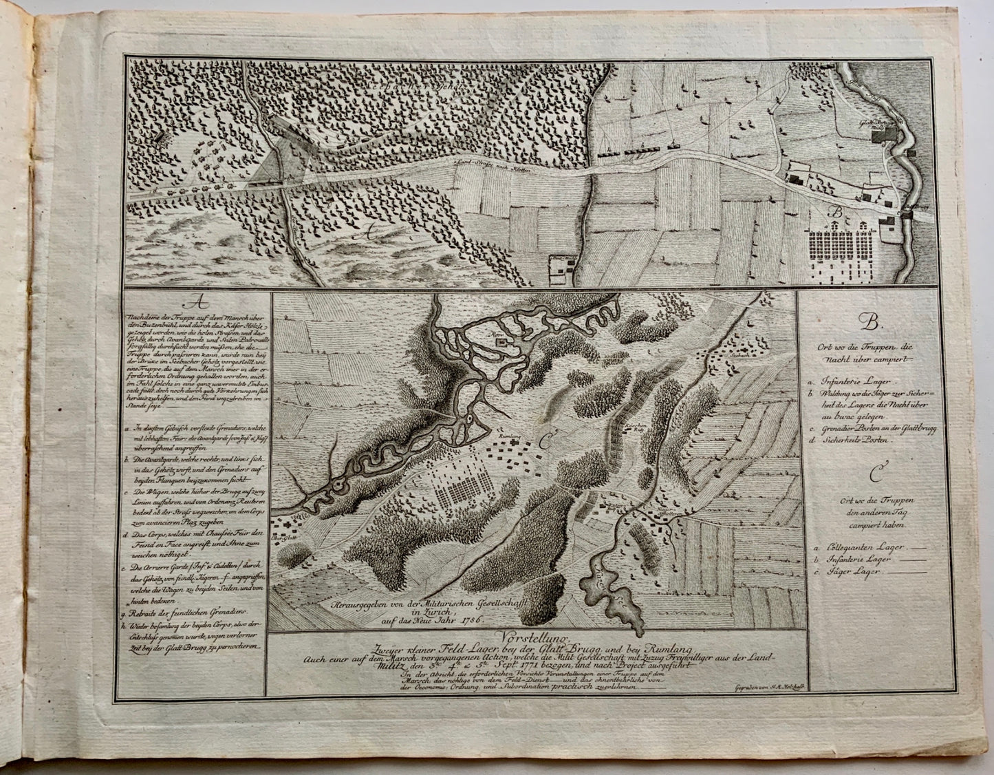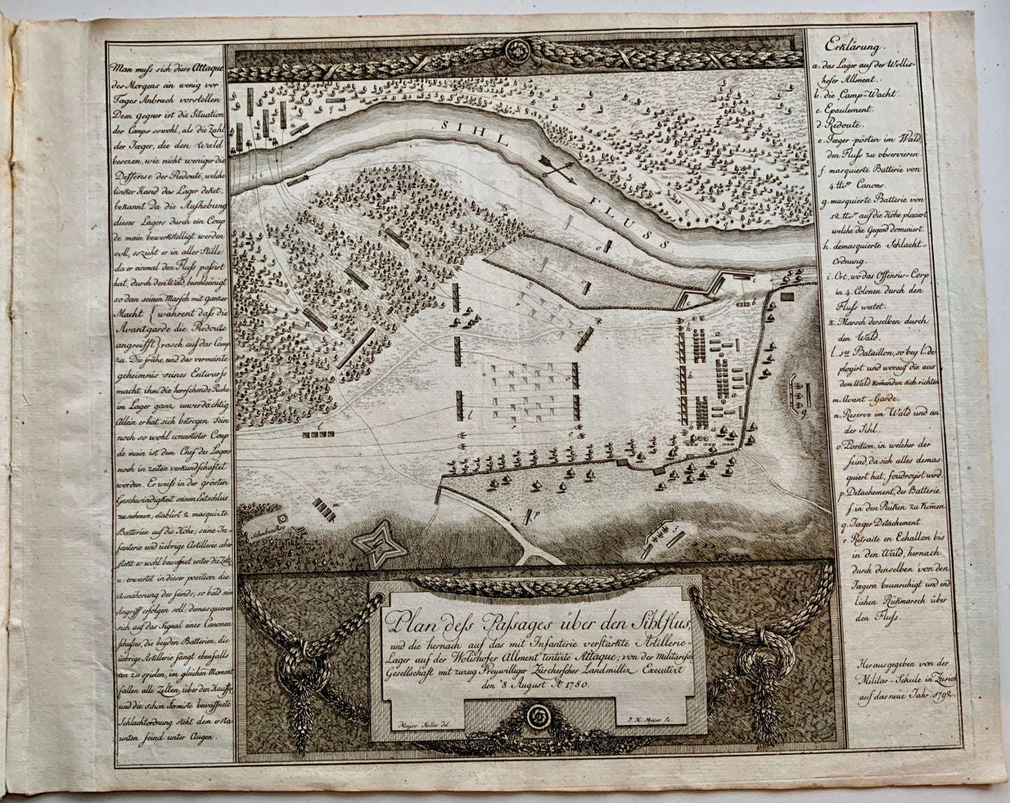 "Zurich's second military company at that time set itself the task of training a powerful basic troop through regular exercises. The revolutionary year 1798 brought the sequence to a standstill in connection with military operations. They partly provide information about the appearance of individual parts of the city and the surrounding landscapes at the time. With engraved verses and explanations. " (Pipe). The sheets in large folio were used for technical artillery training.