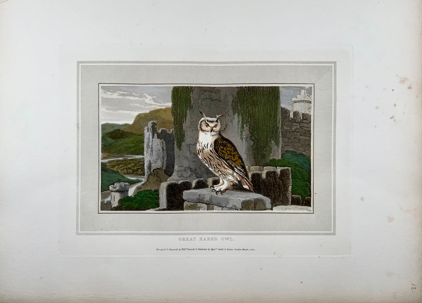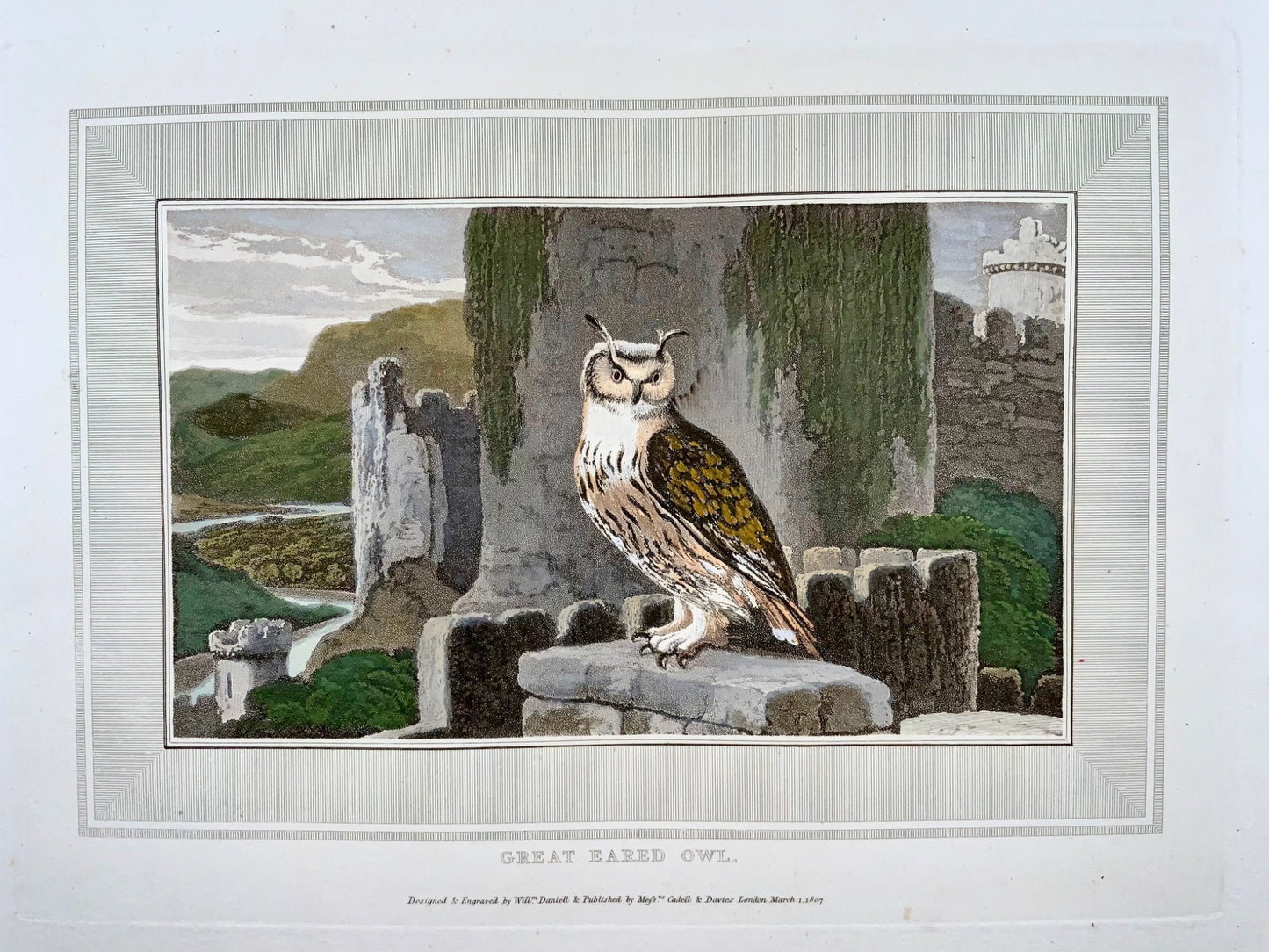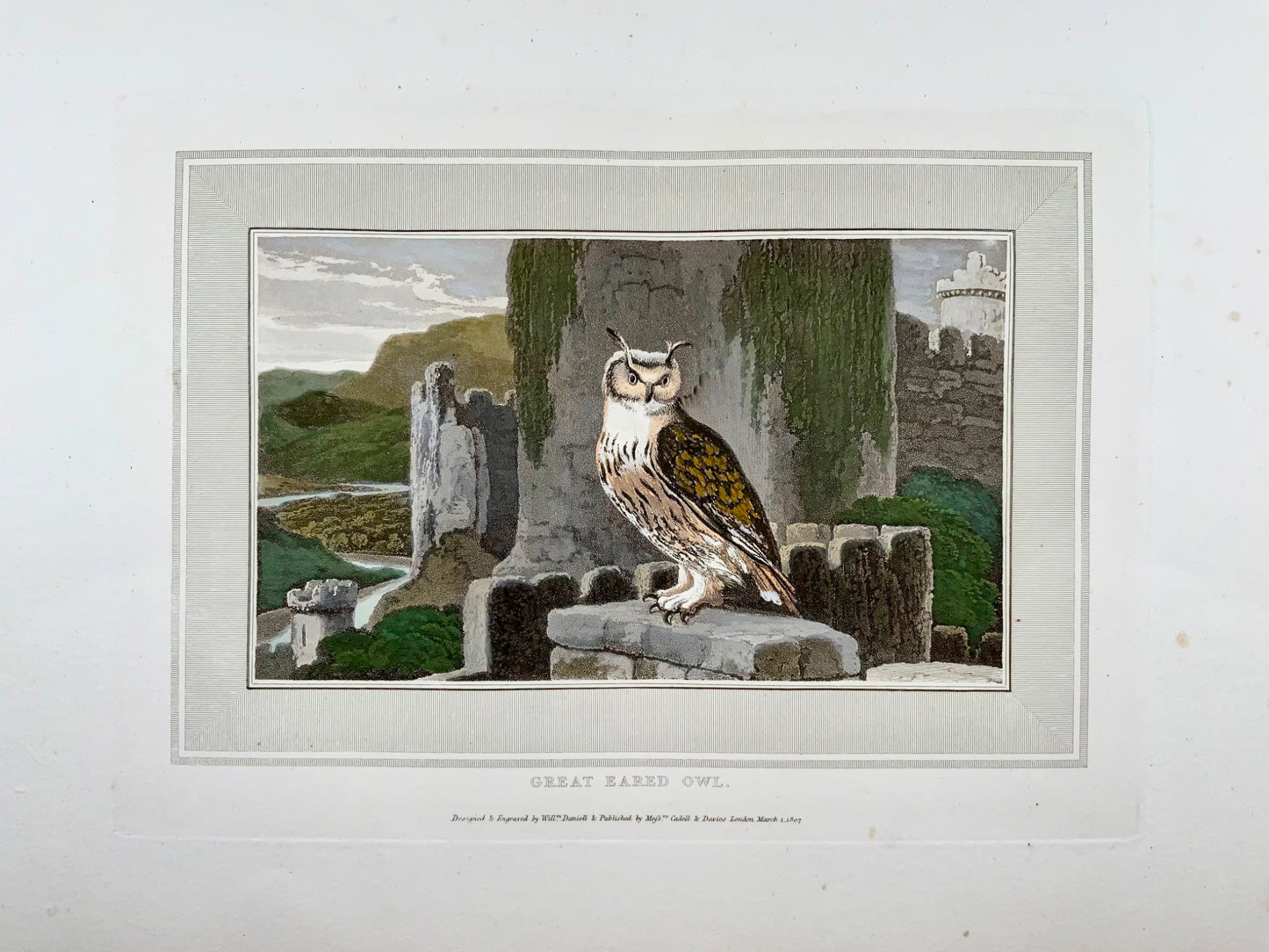 1807 William Daniell, Great Eared Owl, ornithology, hand coloured aquatint