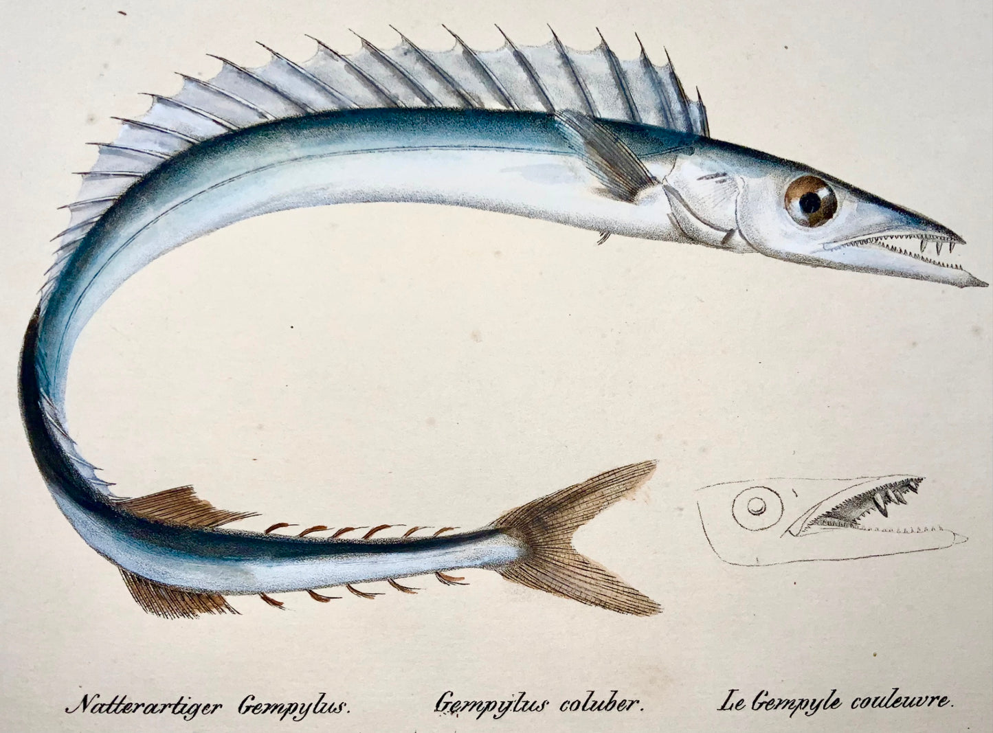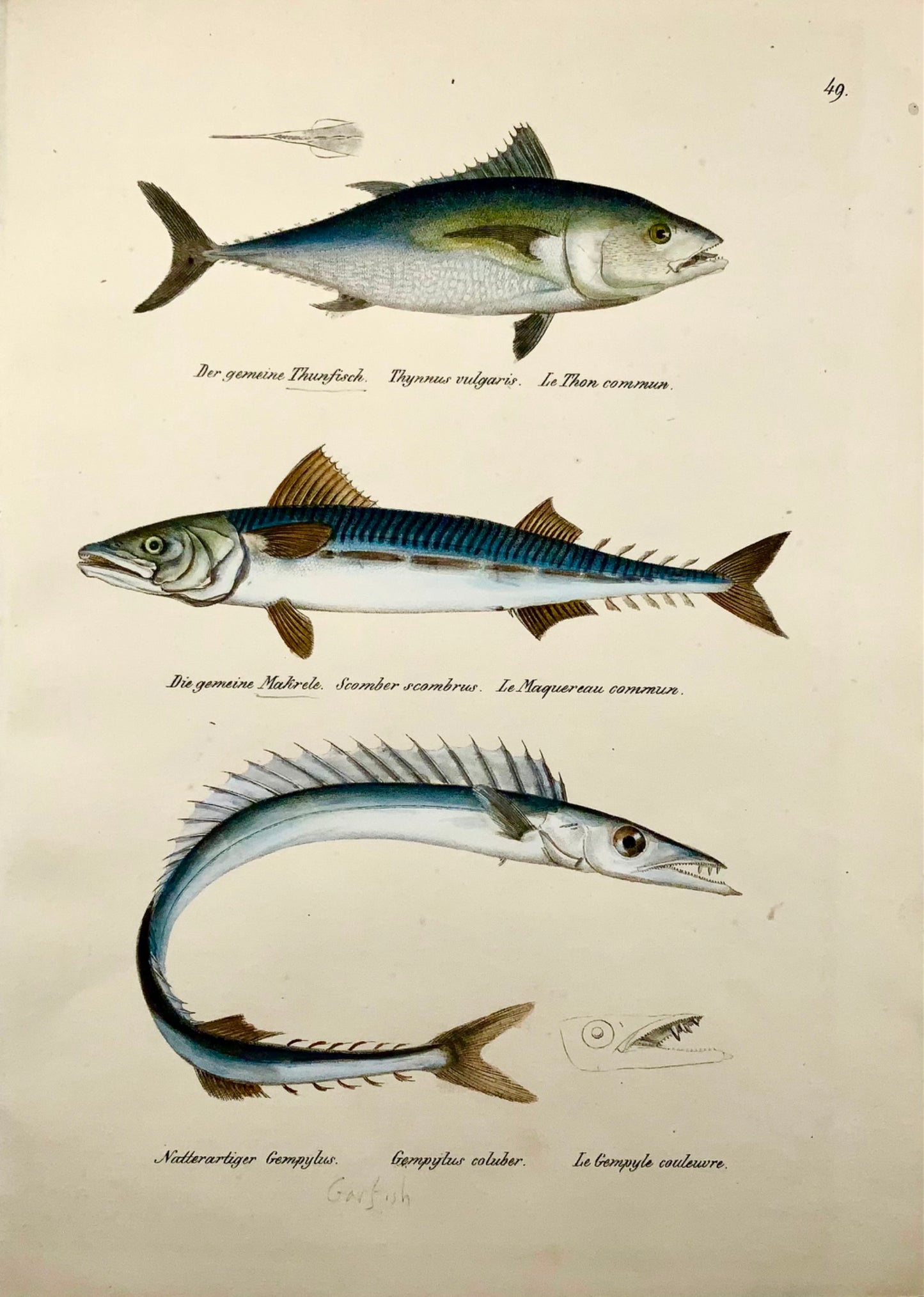 1833 Mackerel, garfish, tuna, H. Schinz (b. 1777) folio, handcoloured lithograph