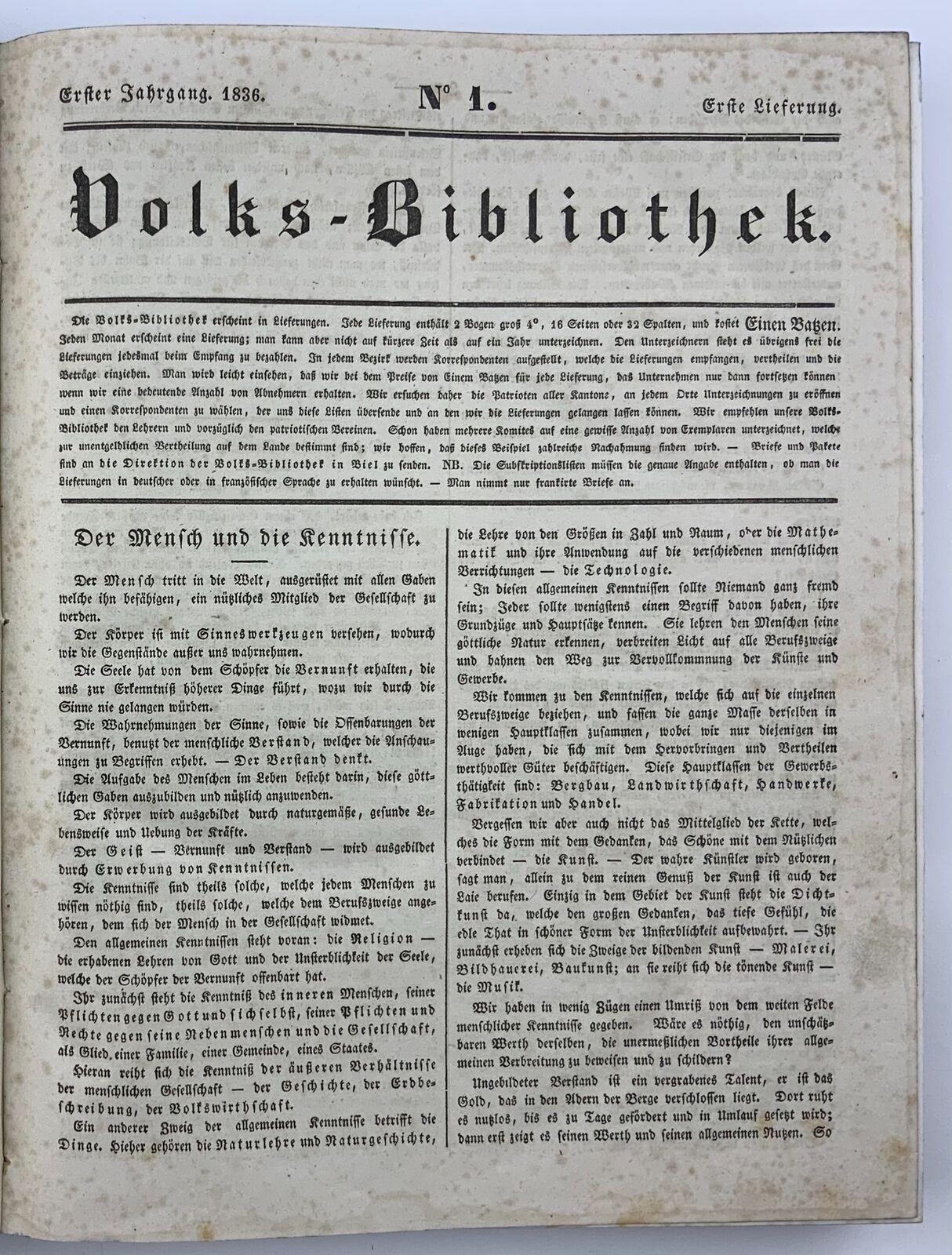 Complete series of the magazine published in Biel for instruction and entertainment. Weingart (1797 - 1878) was a teacher and radical politician and co-editor of the political magazine "Die Junge Schweiz". In 1835 Weingart lost his position as a teacher in Biel for political reasons. He was employed by Johann Rudolf Schneider, the promoter of the Jura water correction, as head of the Schneider book printing shop. The topics of the contributions were deliberately placed outside of political events and were primarily aimed at schools and non-profit associations, covering travel, natural sciences, history of Switzerland and much more.