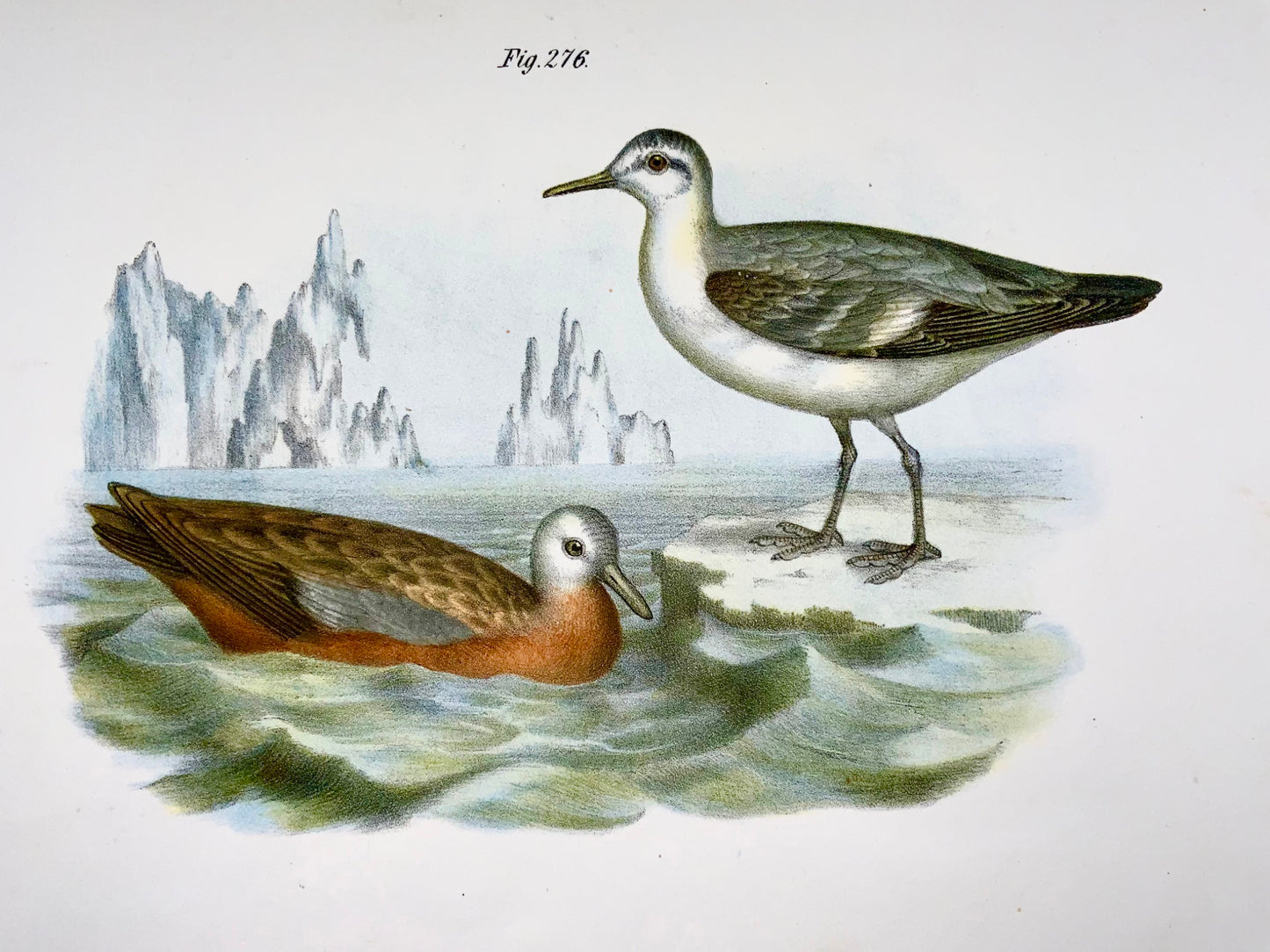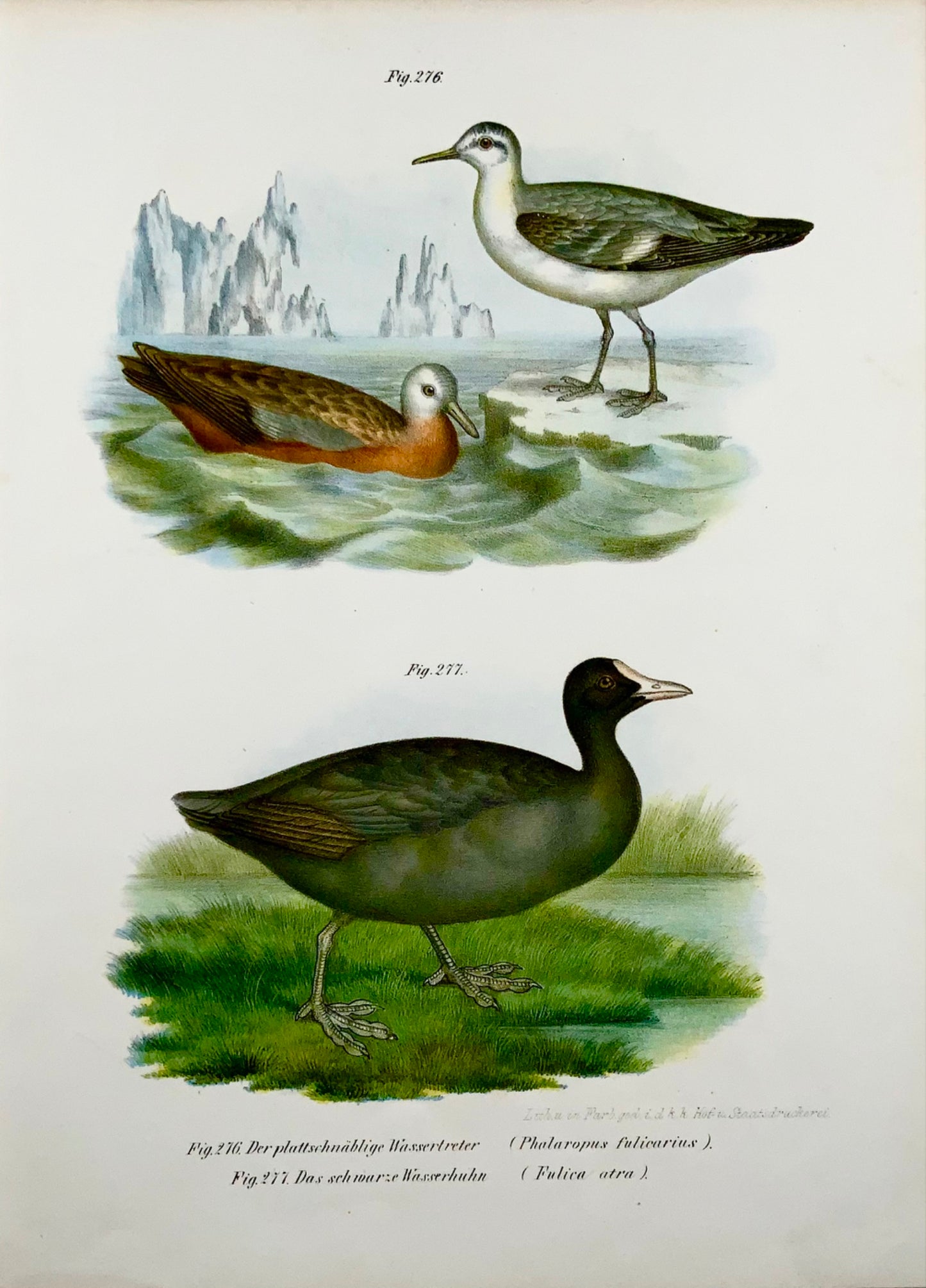 1860 COOT Phalaropus Birds - Fitzinger FOLIO colour lithograph with hand colour