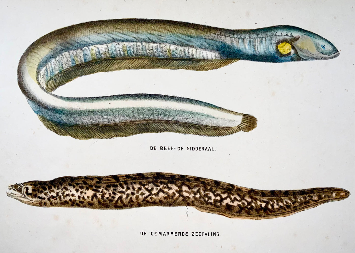 1864 Electric eel, Conger, fish, quarto hand colored stone lithograph