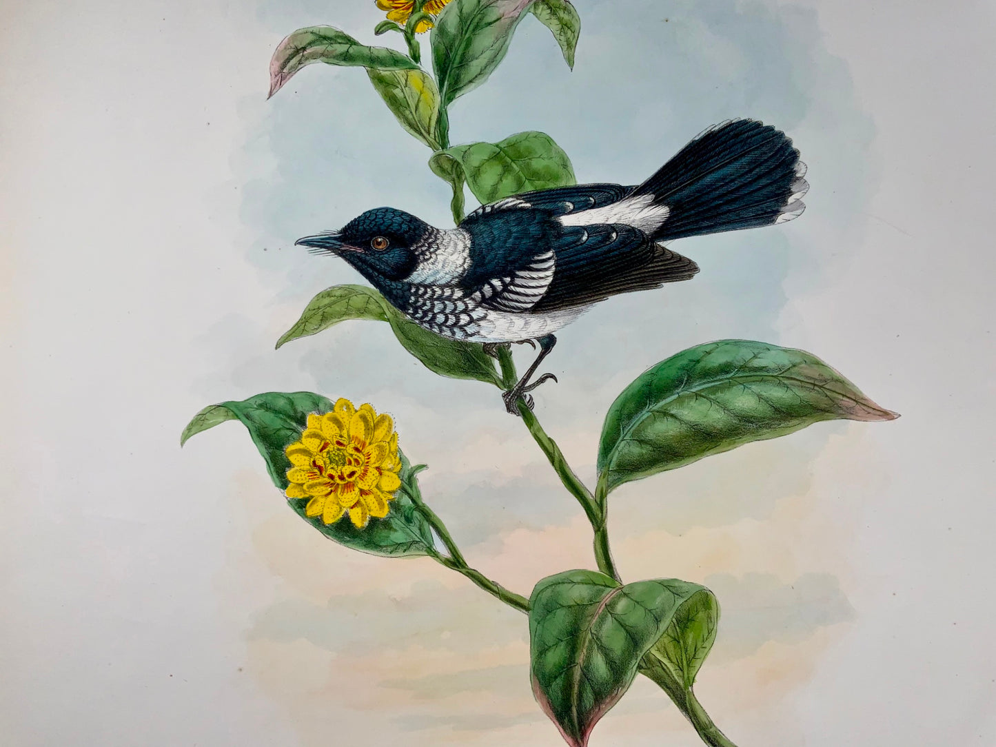 1888 Pied Flycatcher, John Gould (b1804), magnificent hand coloured lithograph, ornithology