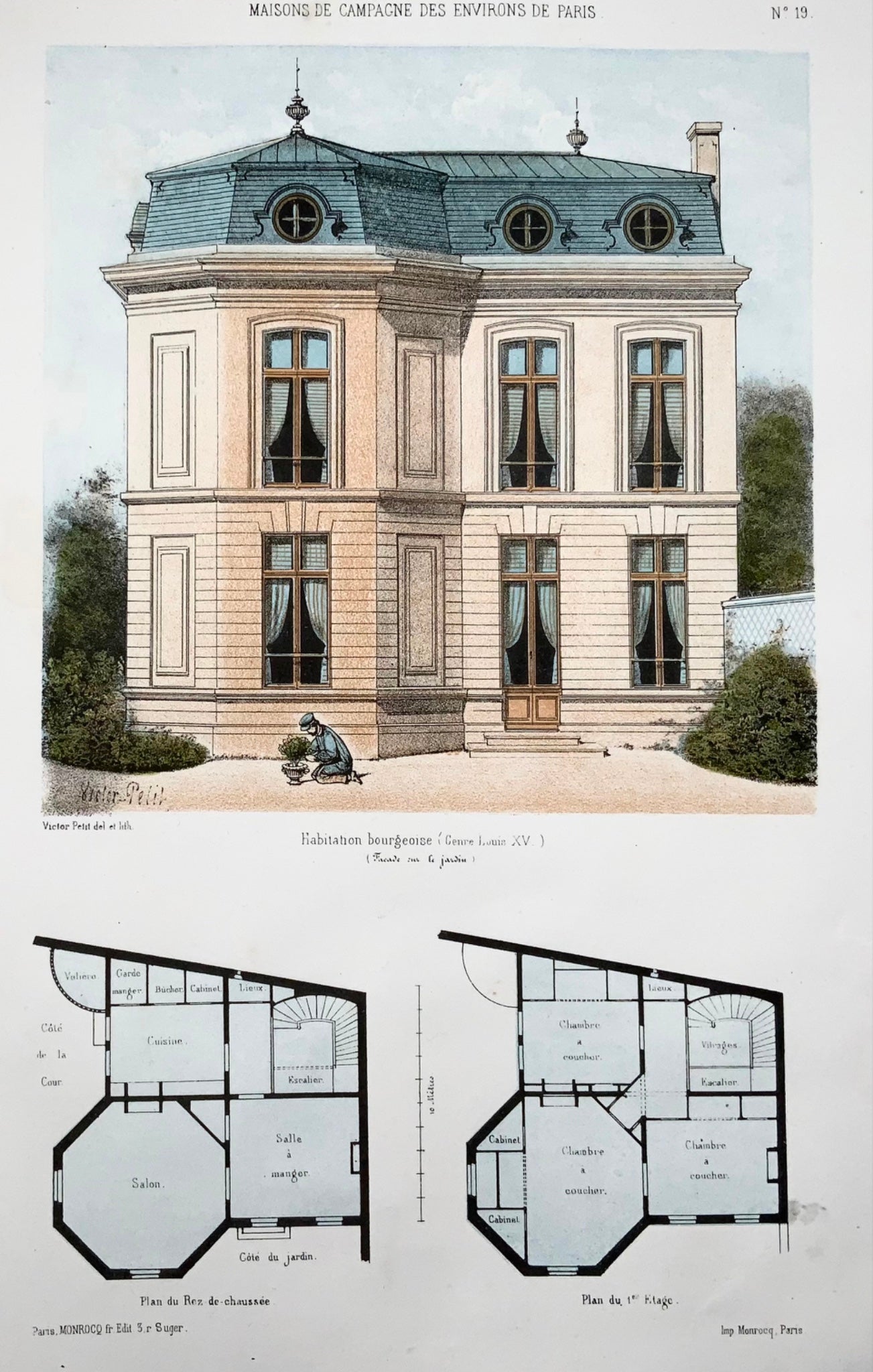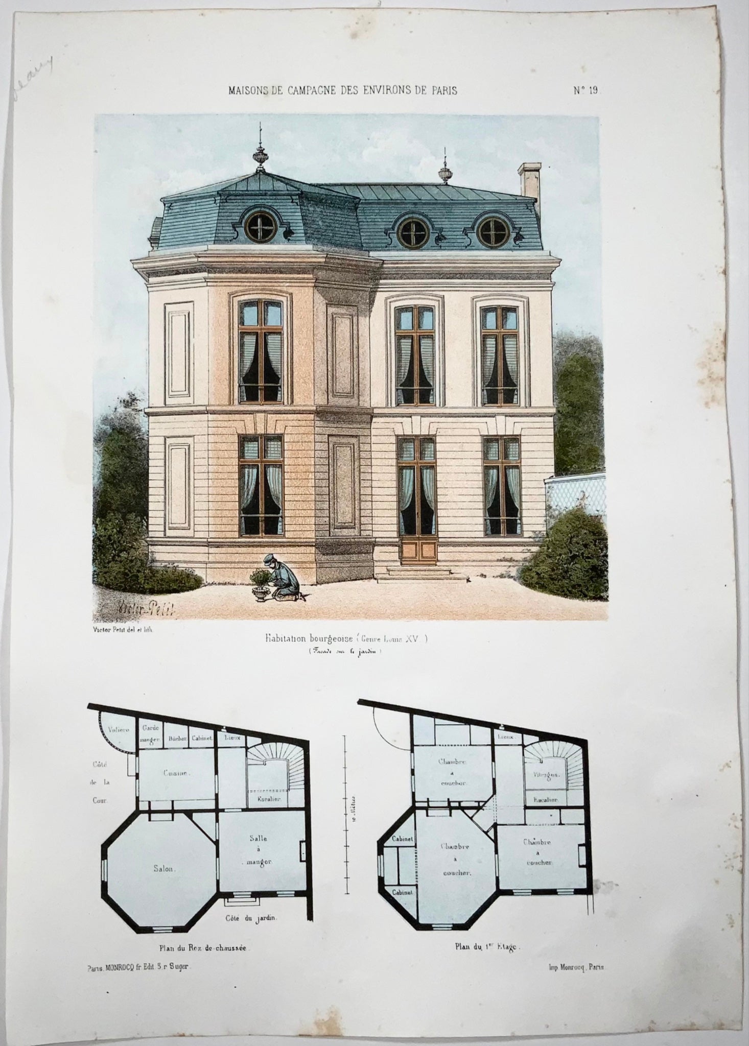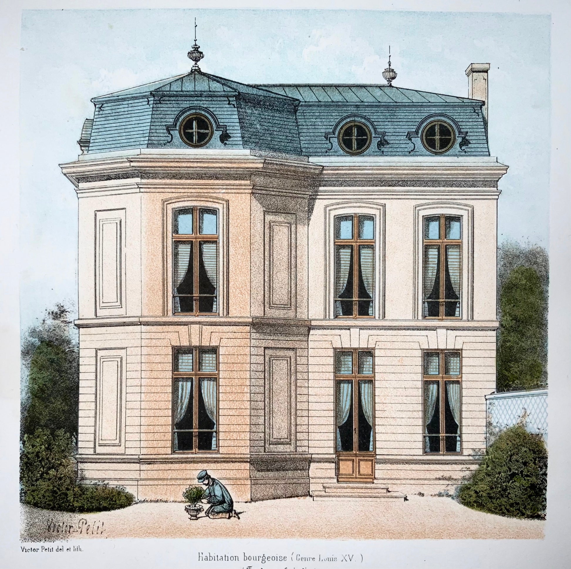 1855 Country House, E. Leblan, original folio colour lithograph, architecture