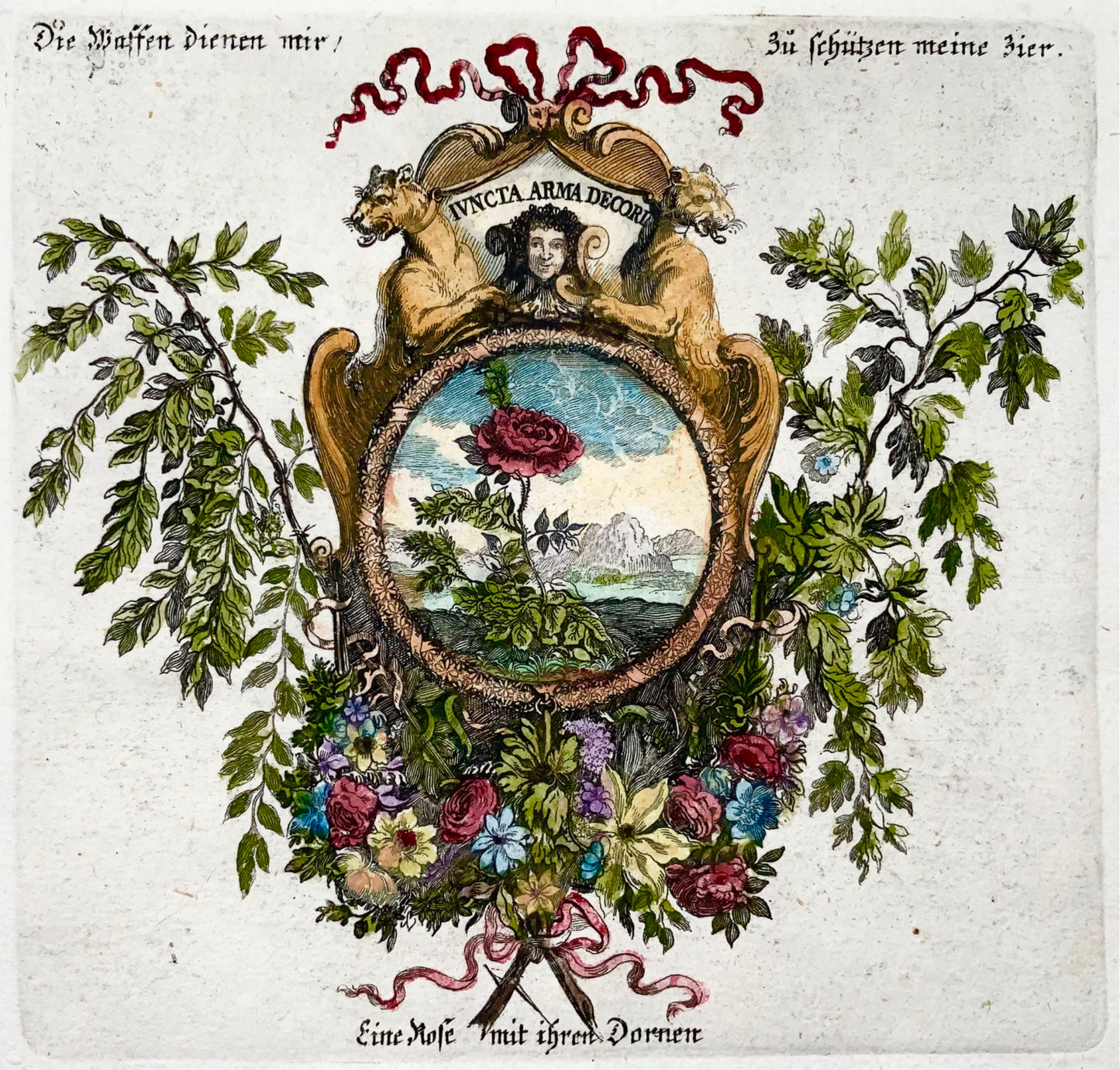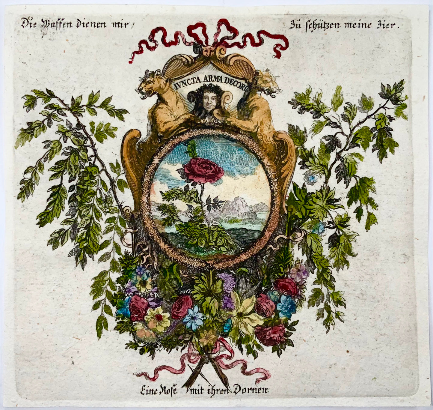 Fine engraving depicting a single a garland of flowers with a rose as centre piece.