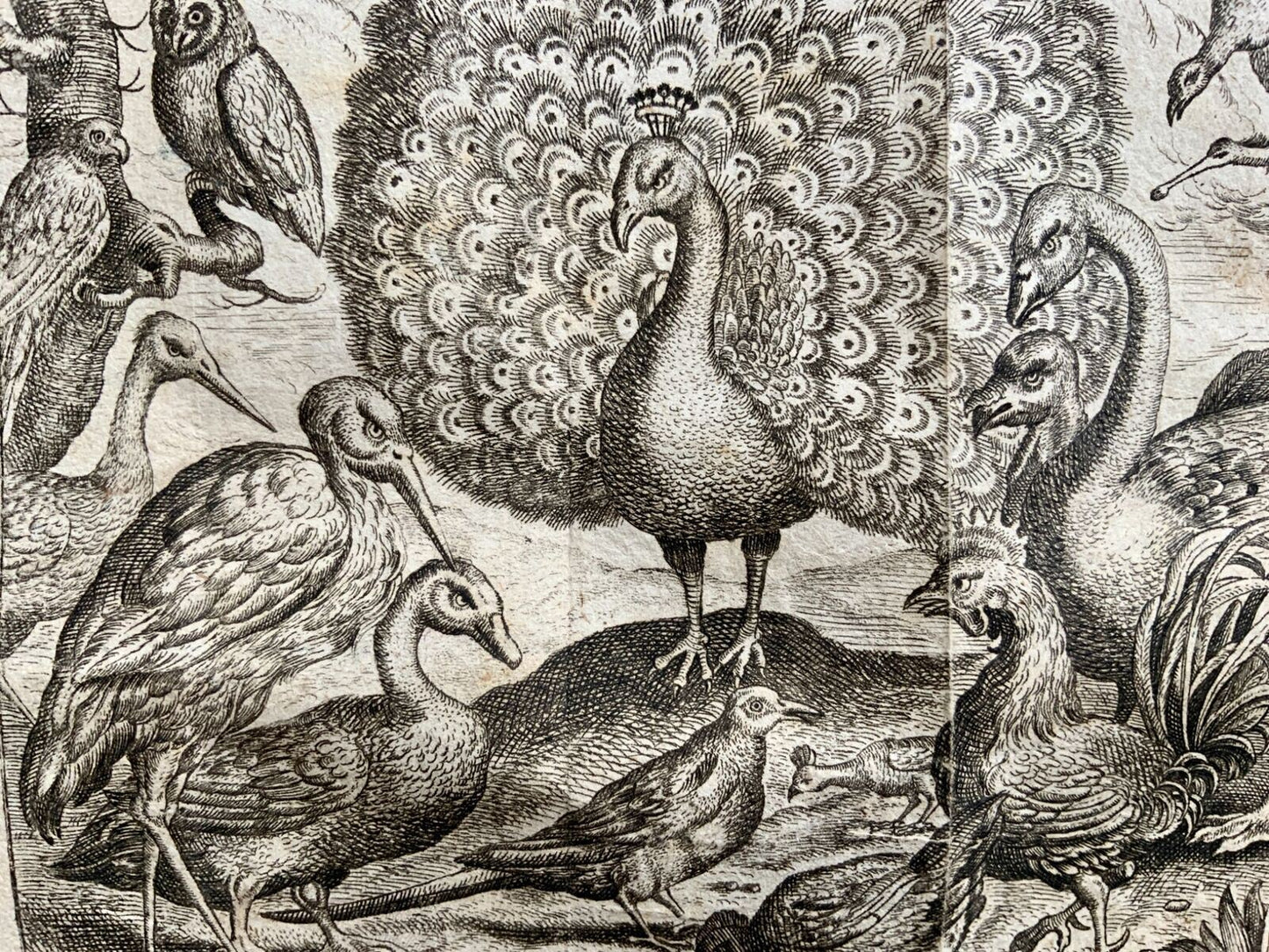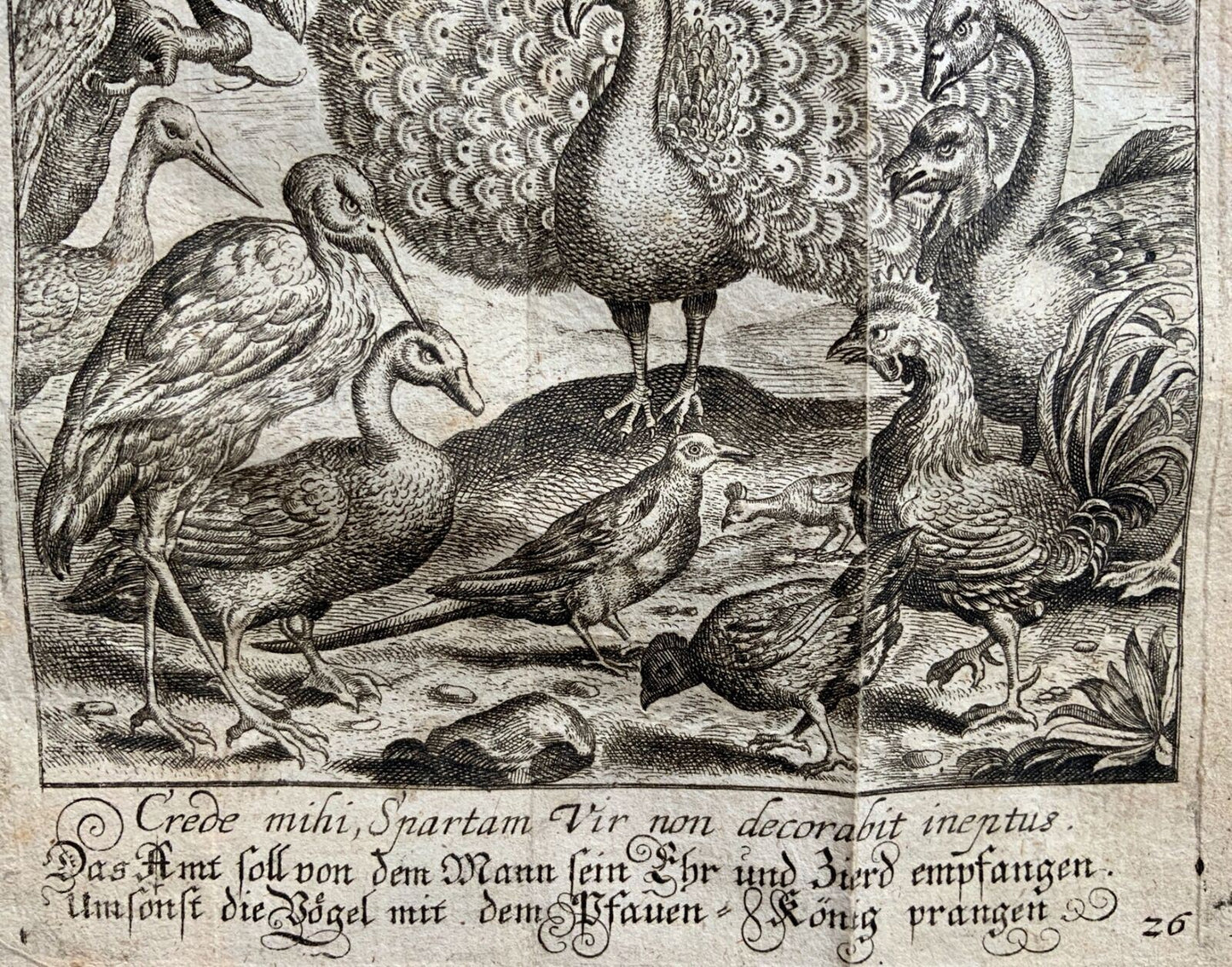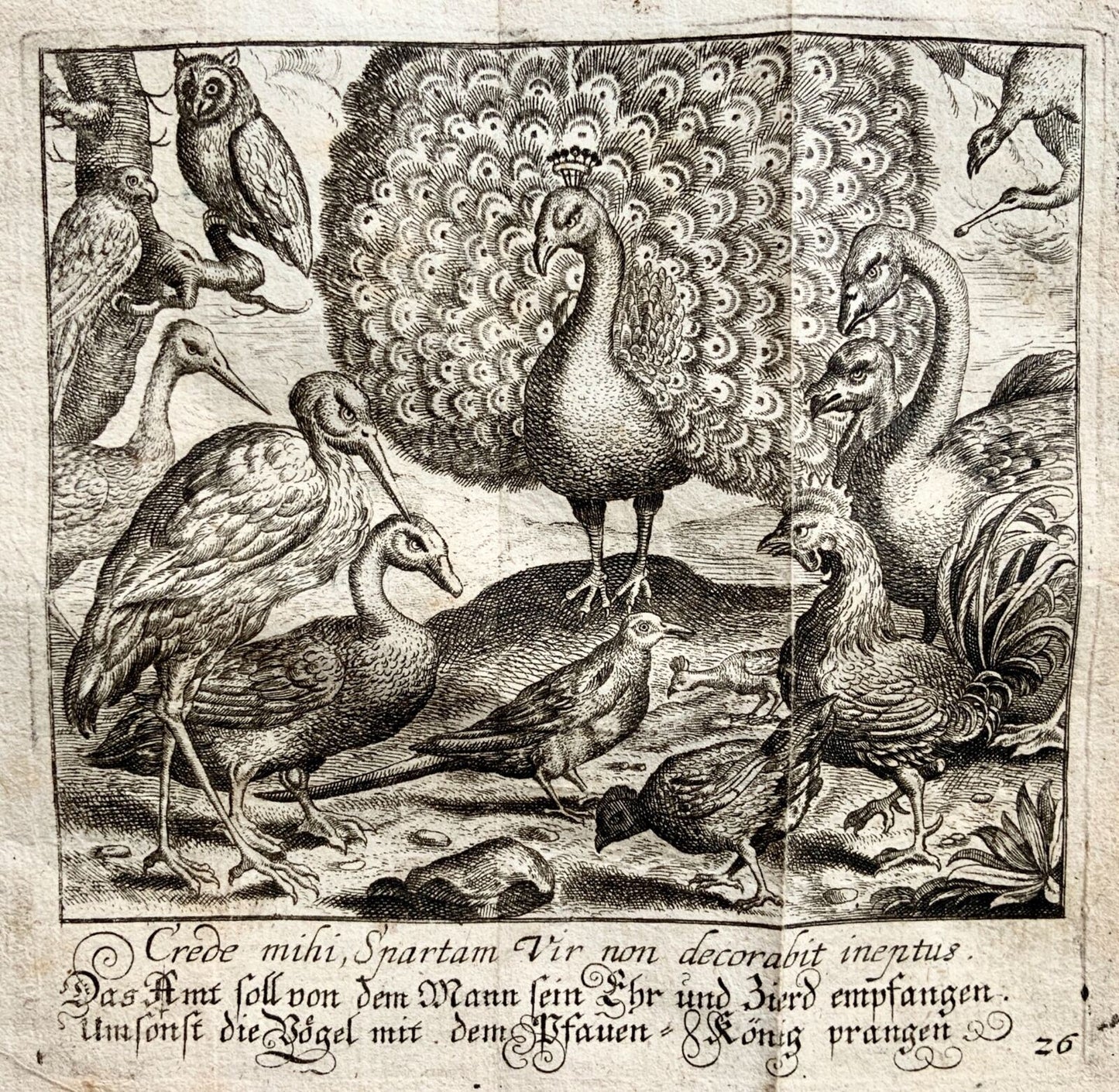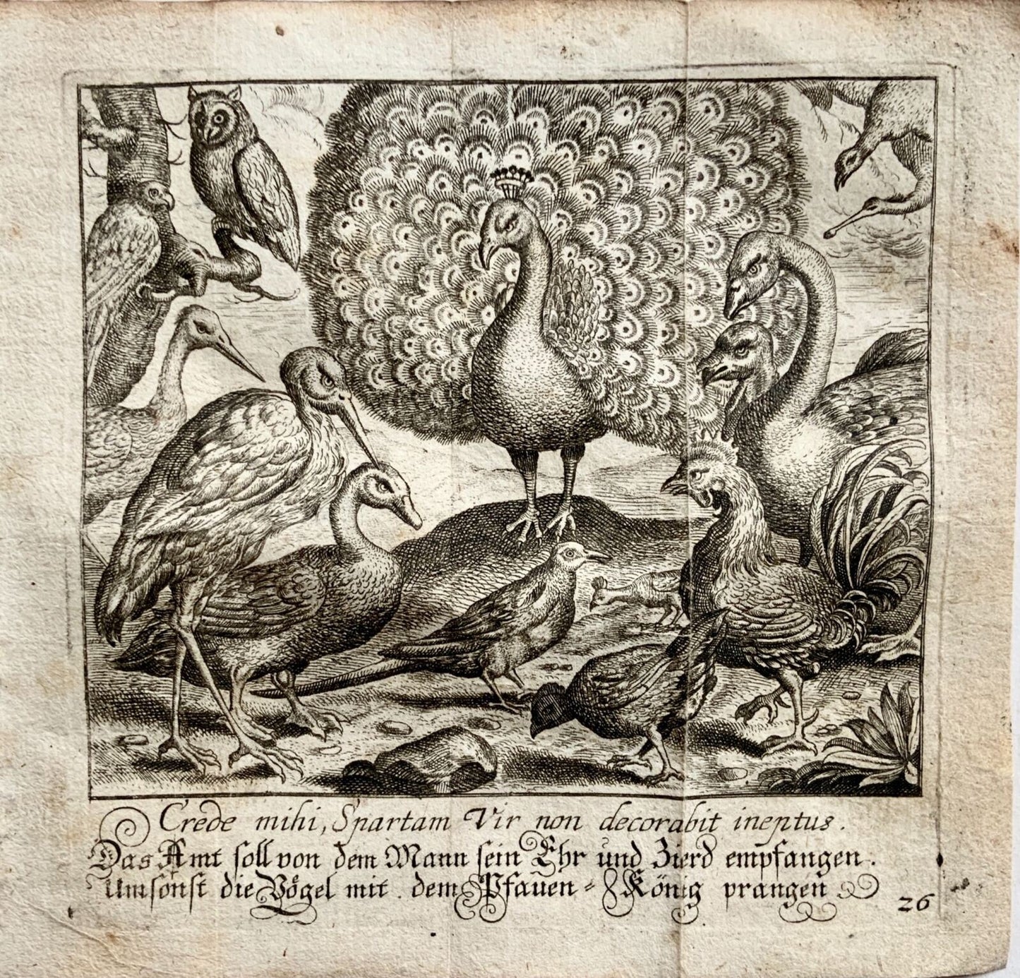 1689 Christoph Schmidts Emblematic engraving of Birds, Peacock, Stork, Owl