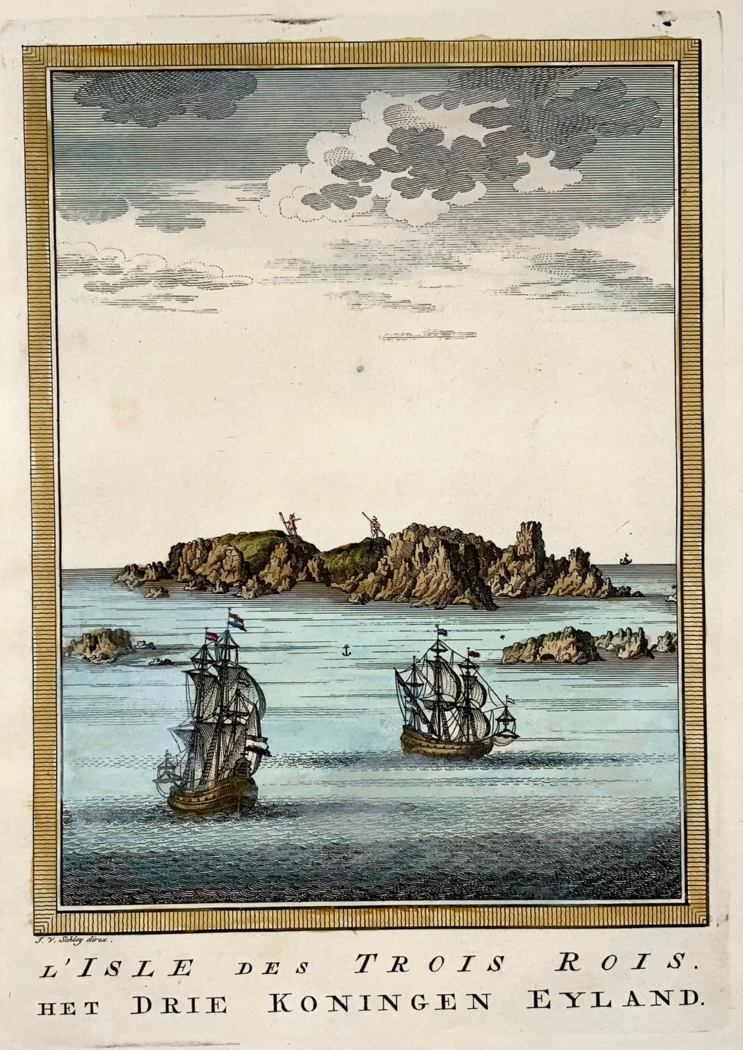 One of the Three Kings Island in the background, with two Maori standing on top, brandishing weapons. In the foreground are the ships of Abel Tasman, the Heemskerck and the Zeehaen.
