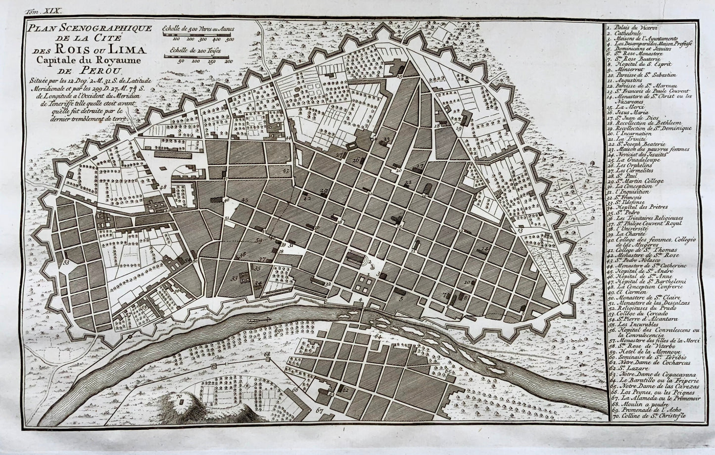 Plan of Lima showing the city as it appeared before its destruction by the great earthquake of 1746. An index of important buildings is included on the right.