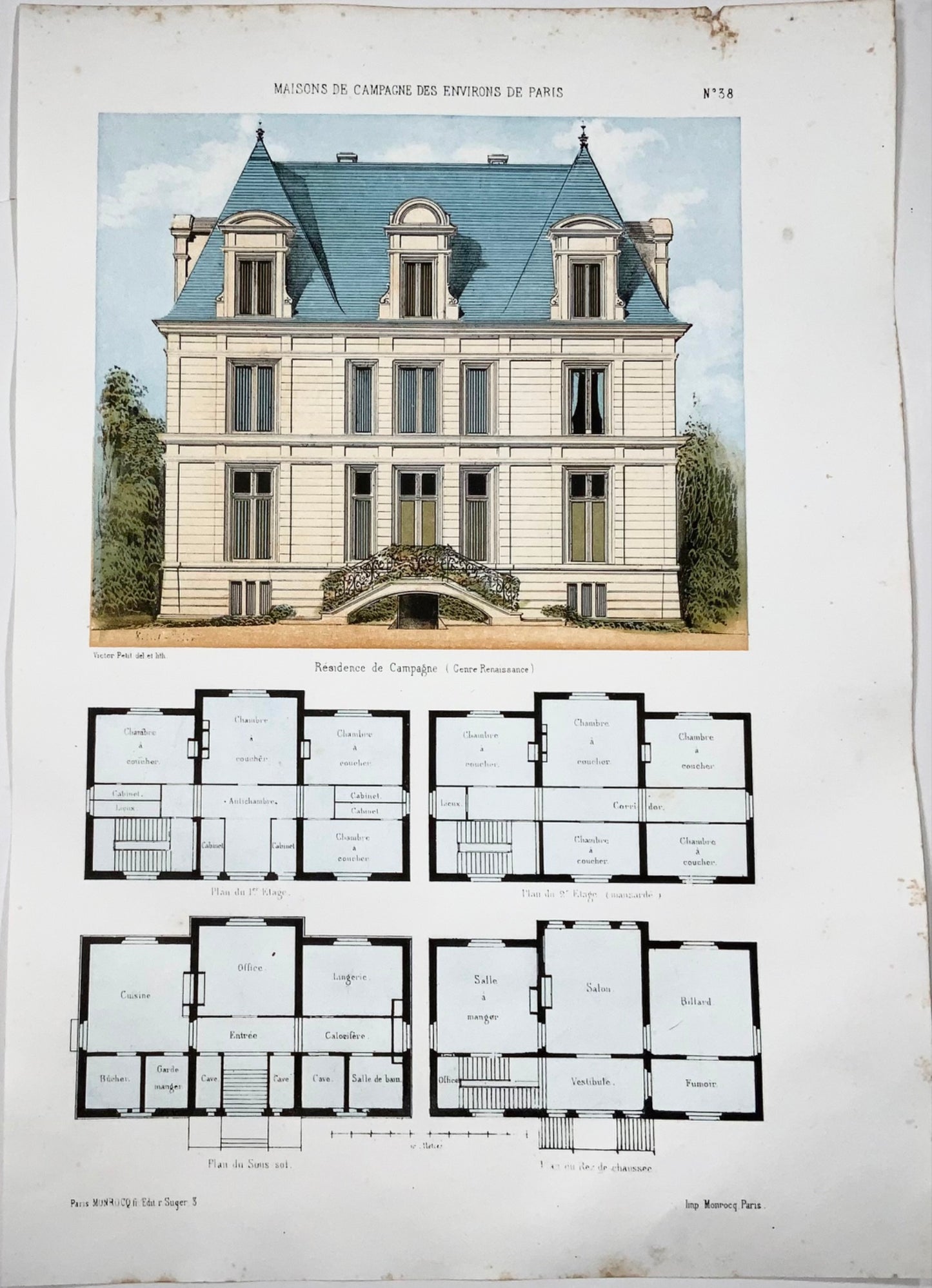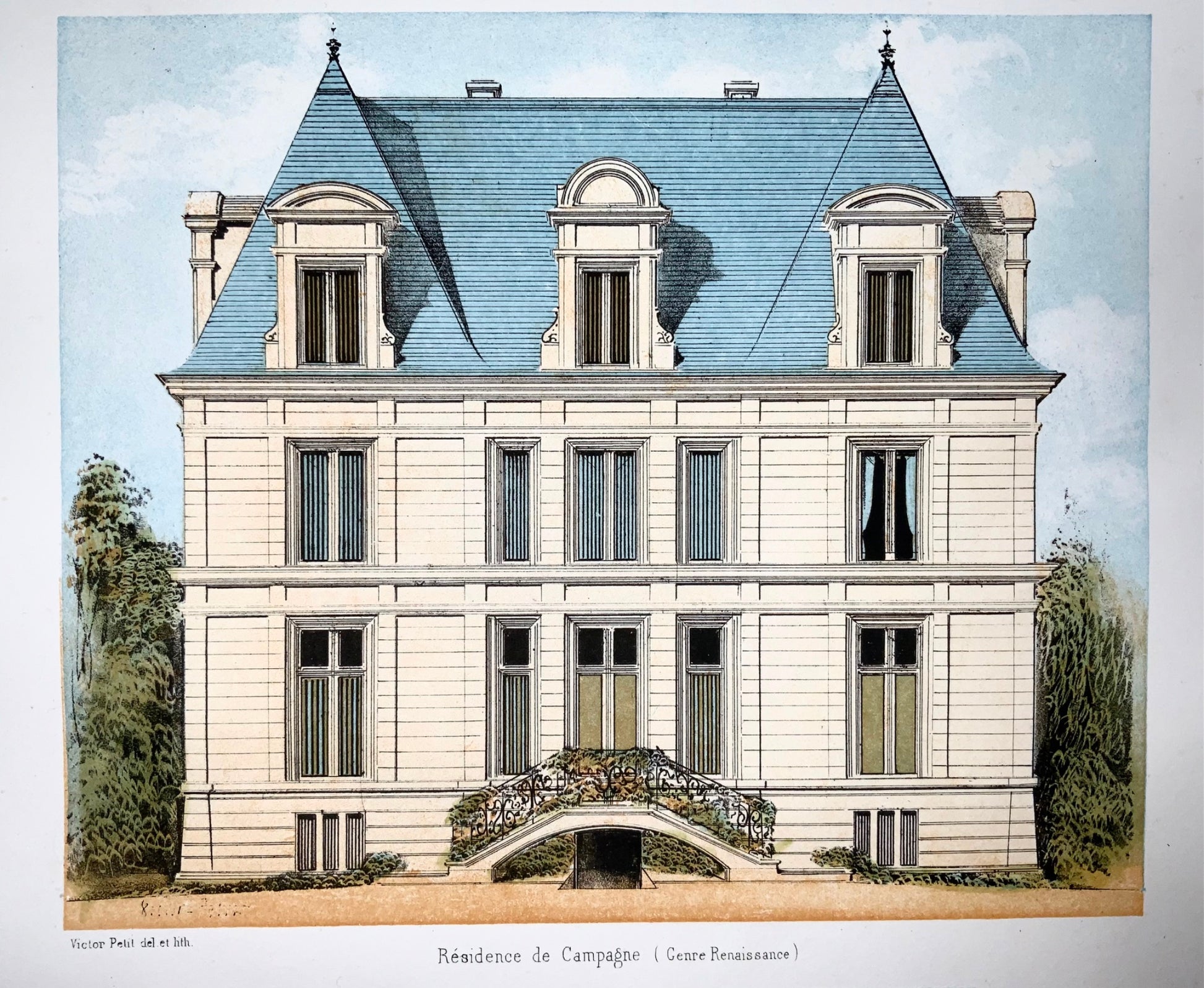 1855 Country Villa, E. Leblan, original folio hand-colored lithograph, hand finished, architecture