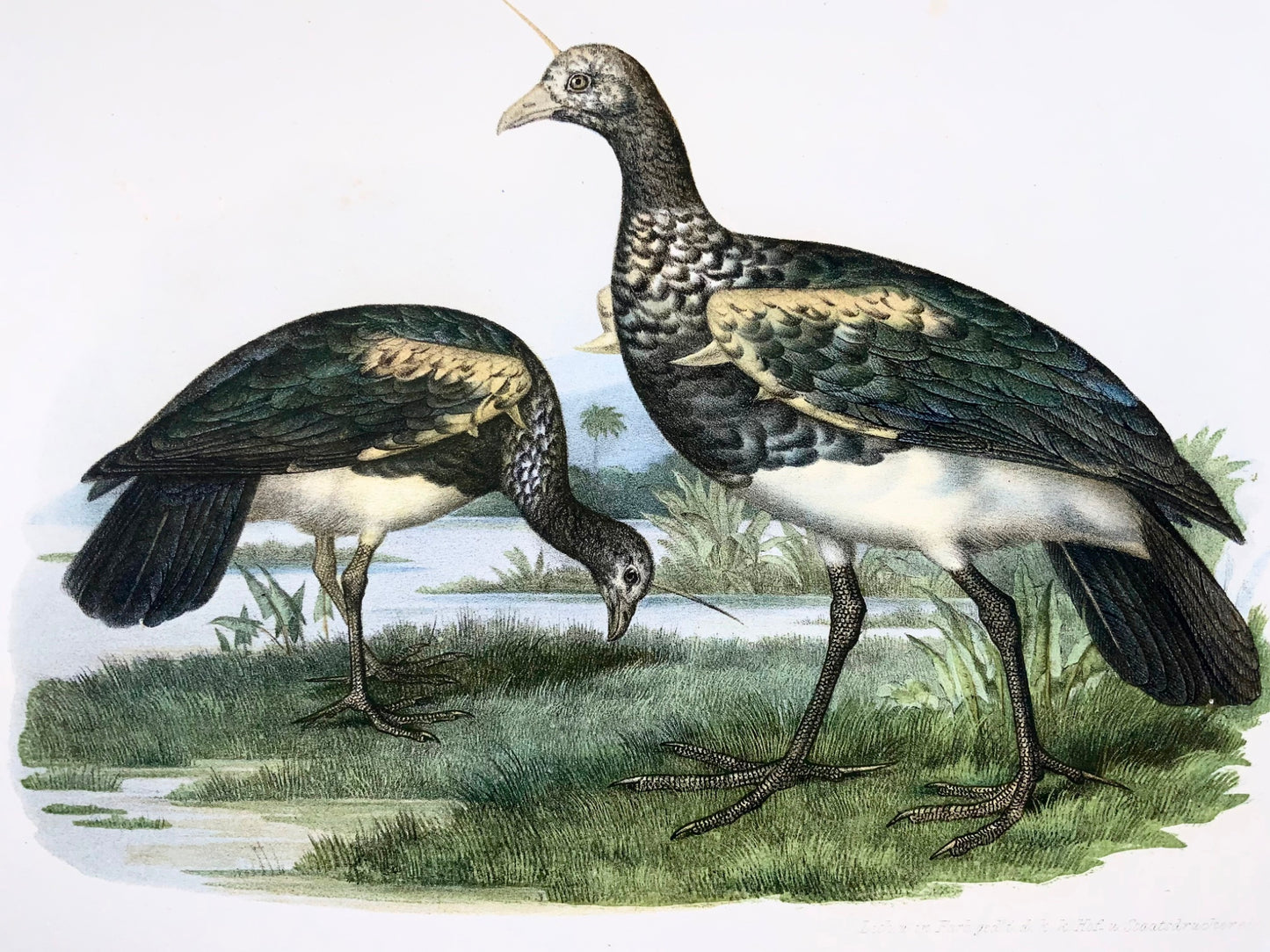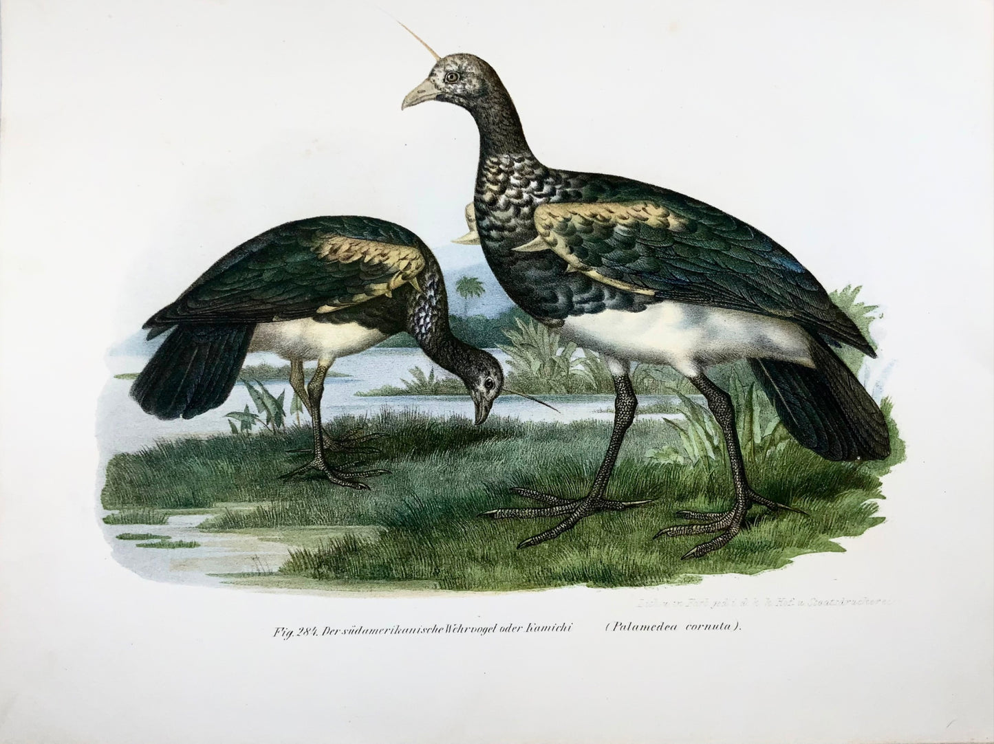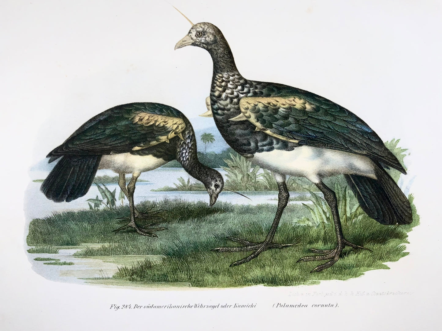 1860 Horned screamer birds, Fitzinger, lithograph, hand finish, ornithology