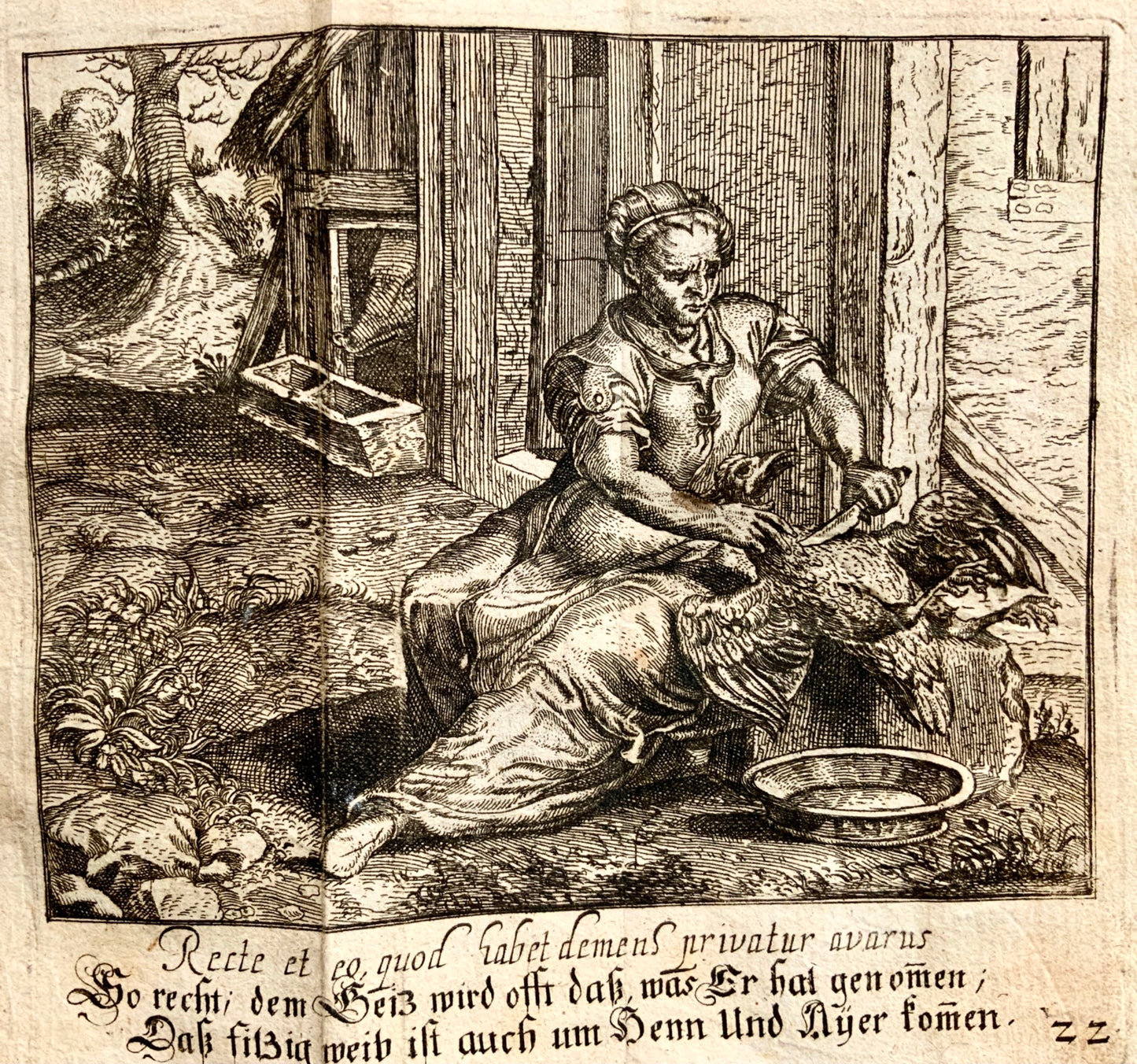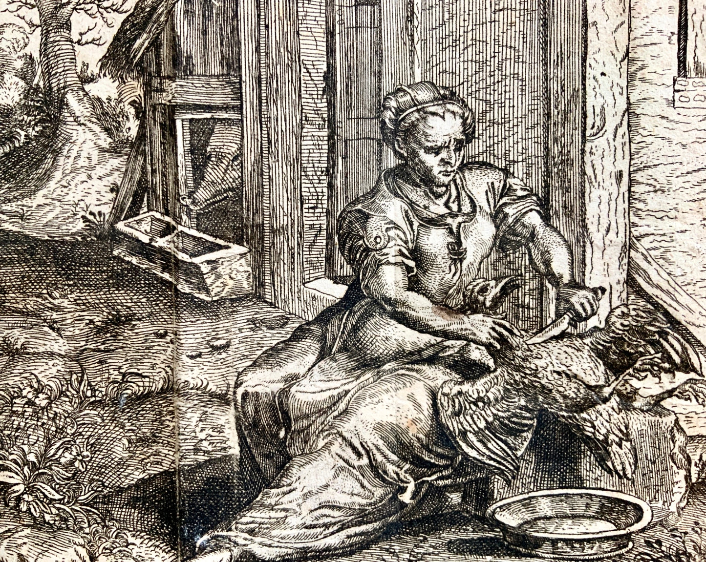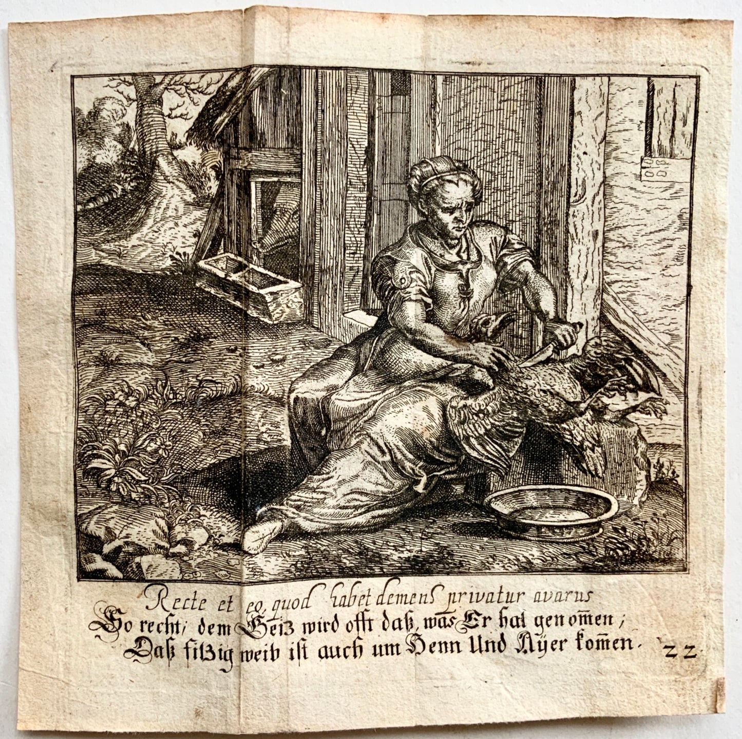 1689 Christoph Schmidts Emblematic engraving Farmer Preparing a Chicken - Food, Agriculture