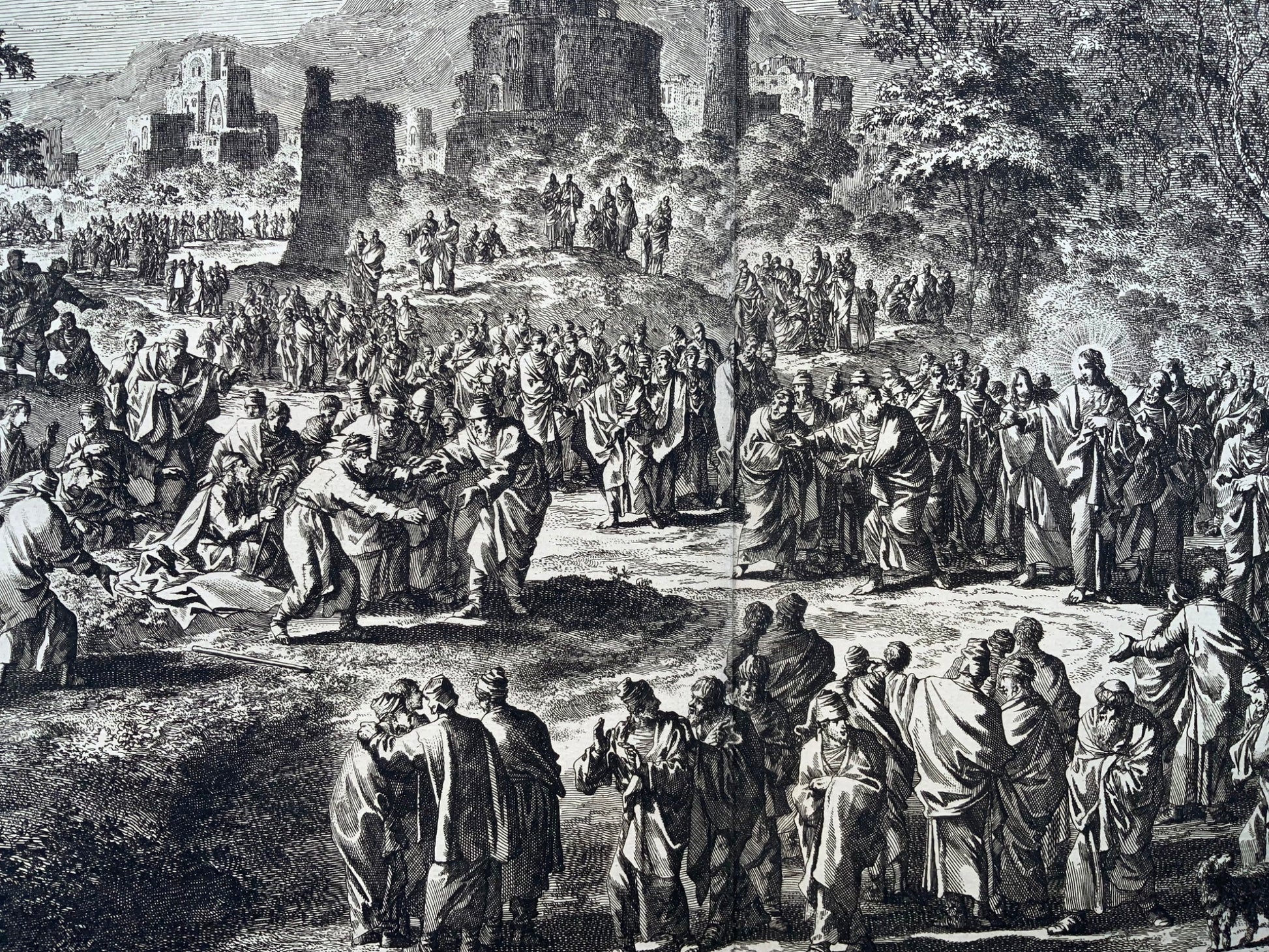1708 Bartimaeus the blind man, J. Luyken, bible, large double page folio 52.8 cm