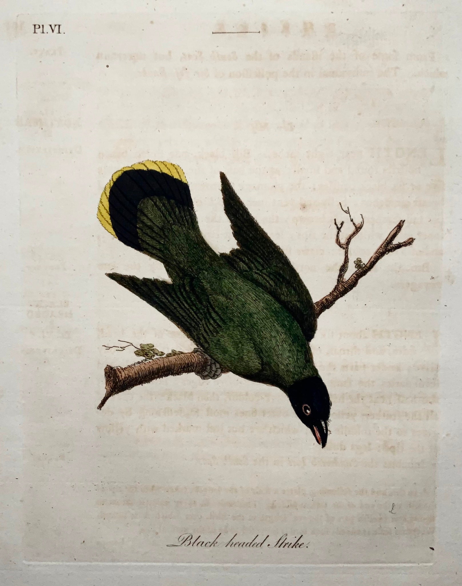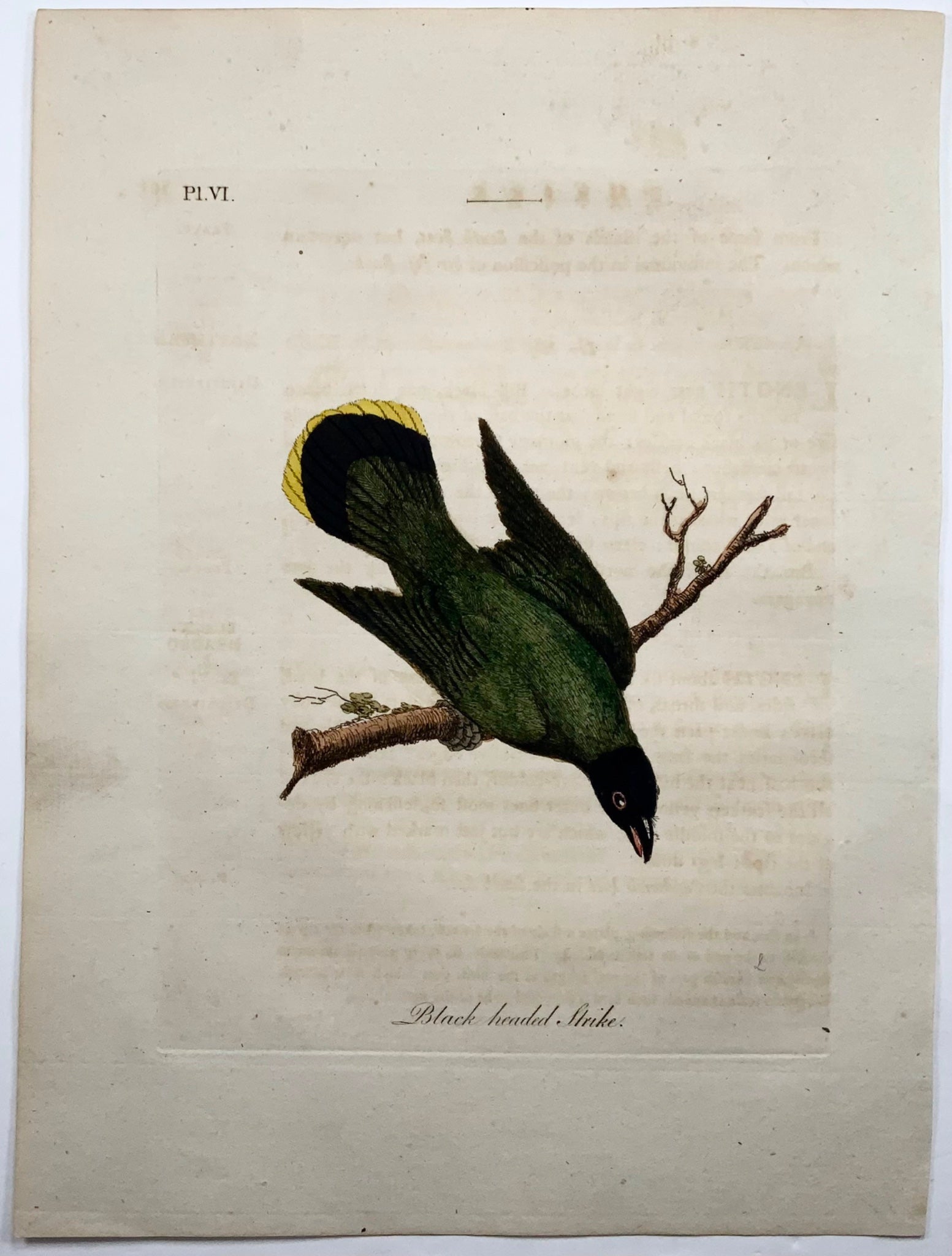 1785 John Latham - Black Headed Shrike - hand coloured engraving - Ornithology