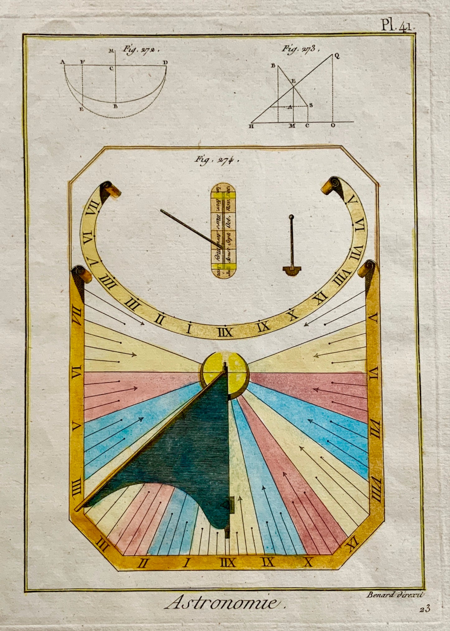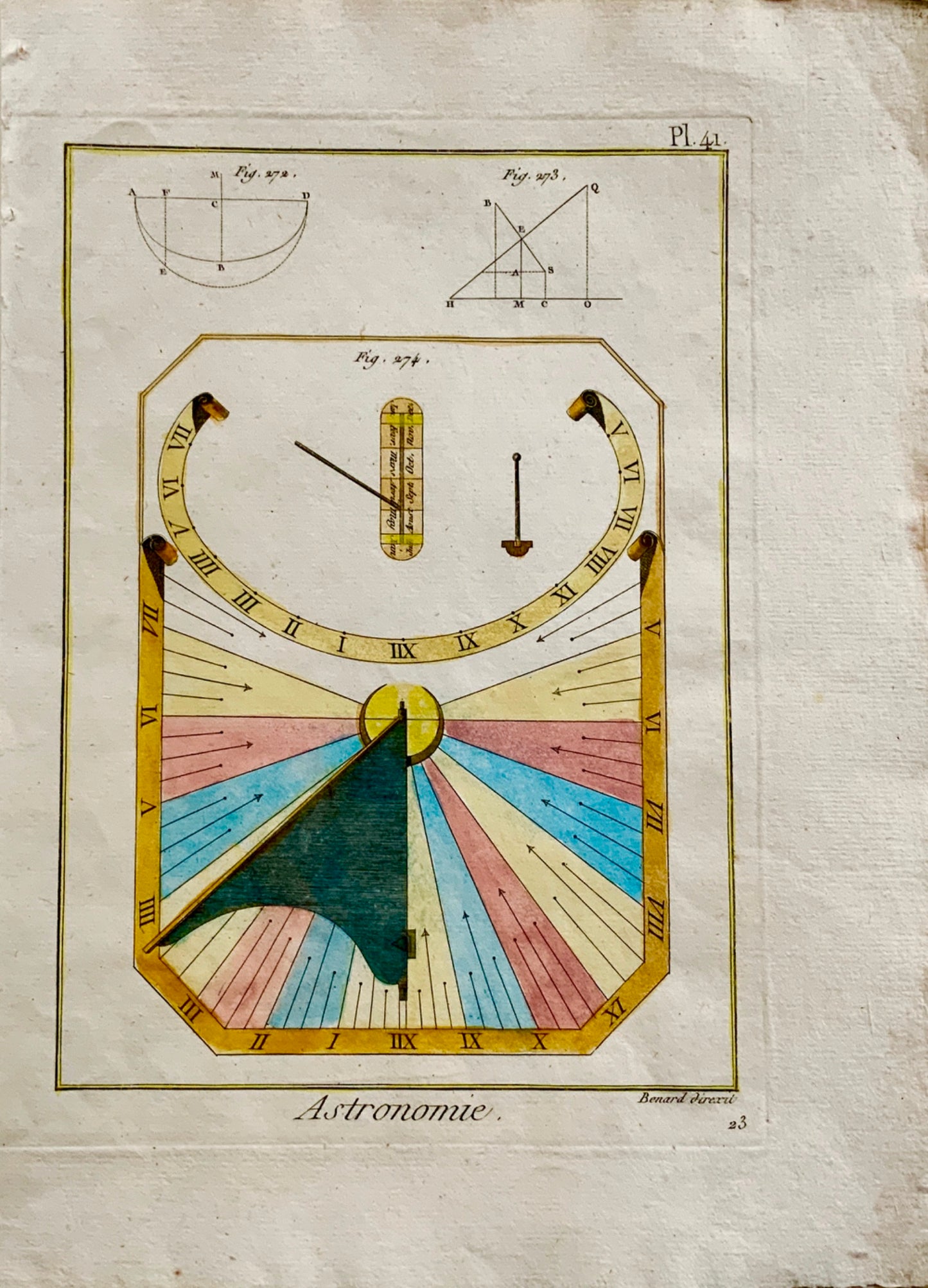 1789 Benard - Astronomie SUN DIAL - Gravure in-quarto couleur à la main - Astronomie