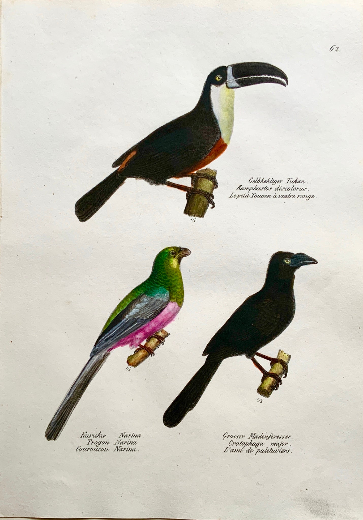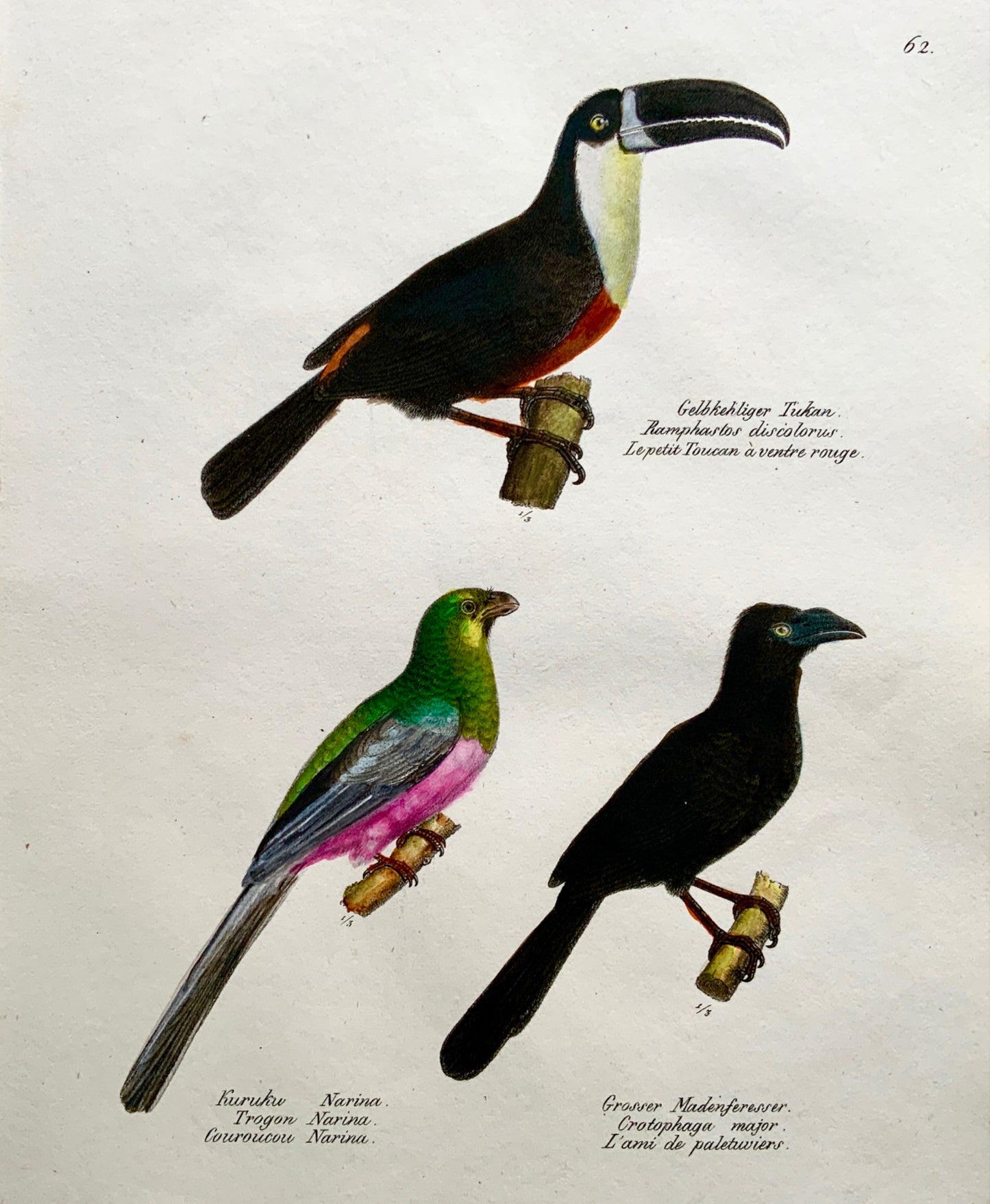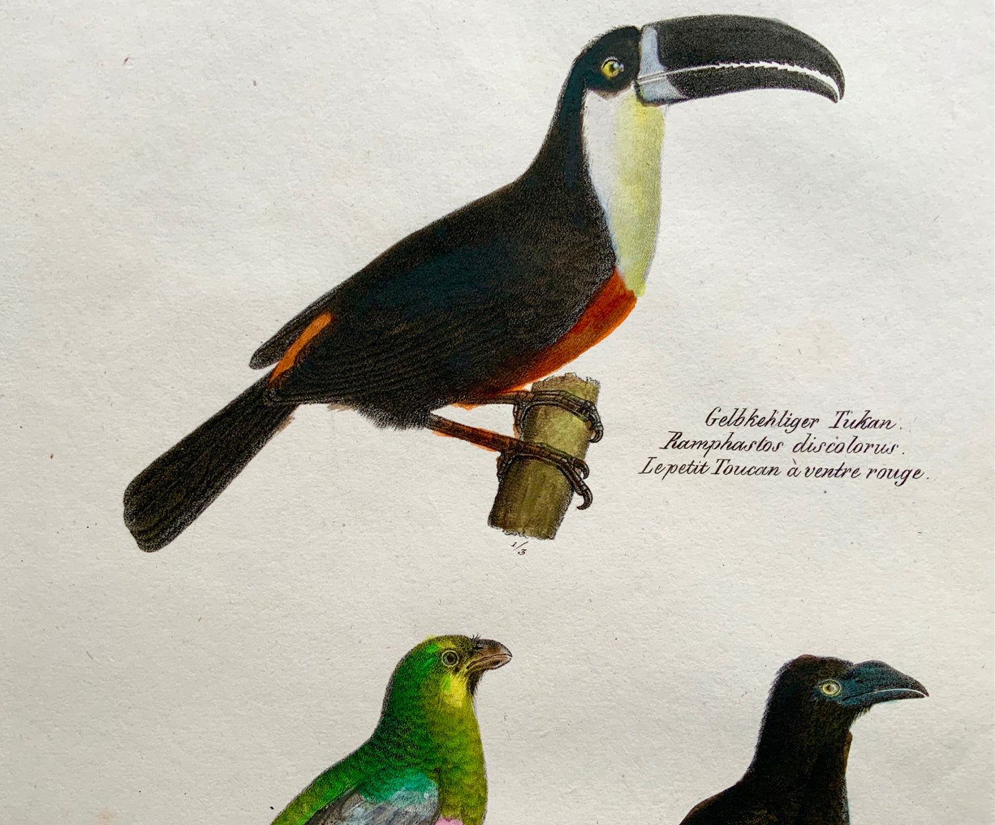 1830 TUCAN Trogon Ornithology - Lithographie FOLIO colorée à la main de Brodtmann