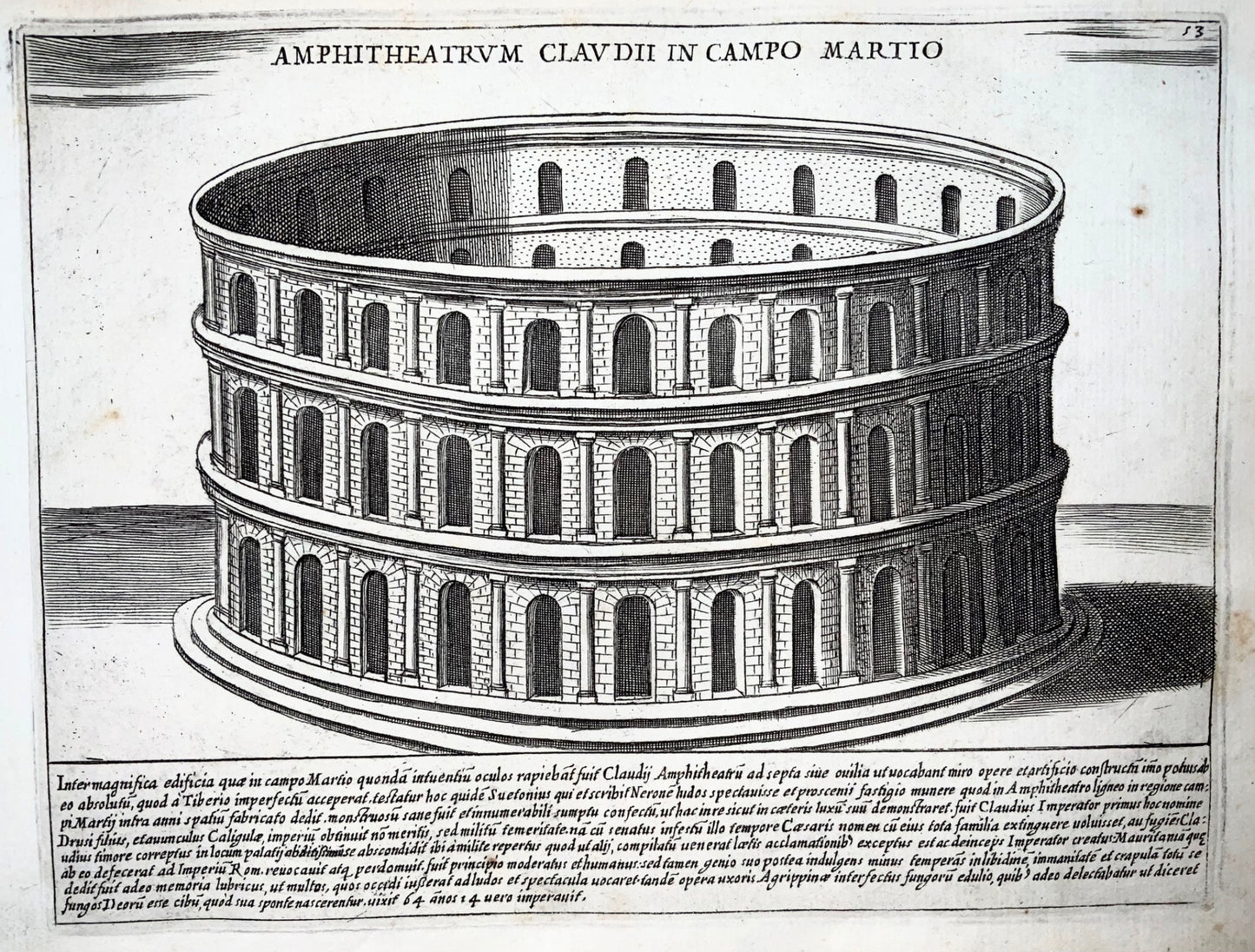 The title indicates that this round arcaded structure was on the Campus Martius and was attributed to Emperor Claudius. Though Emperor Claudius appeared to have undertaken a number of important building projects, an amphitheater is not listed among these.