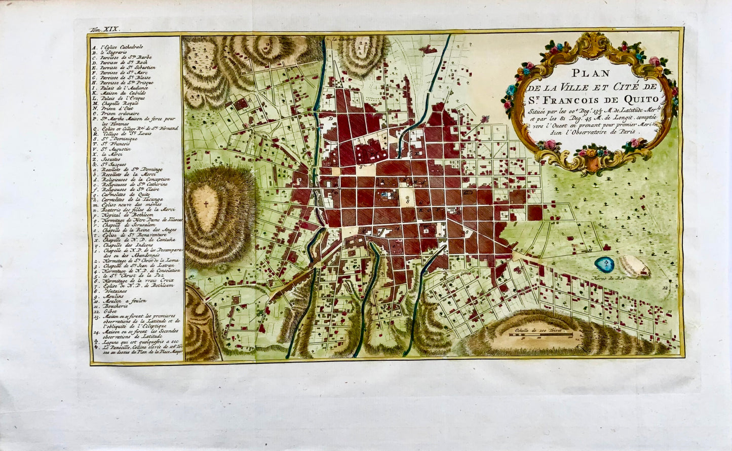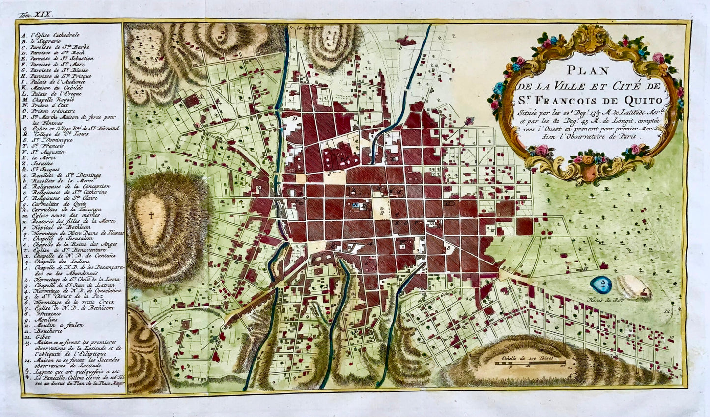 Scarce attractive early map of the city of Quito which was previously known as San Francisco de Quito Ecuador. The map includes an extensive key at left identifying numerous prominent buildings and landmarks. At top right is a superb decorative title.