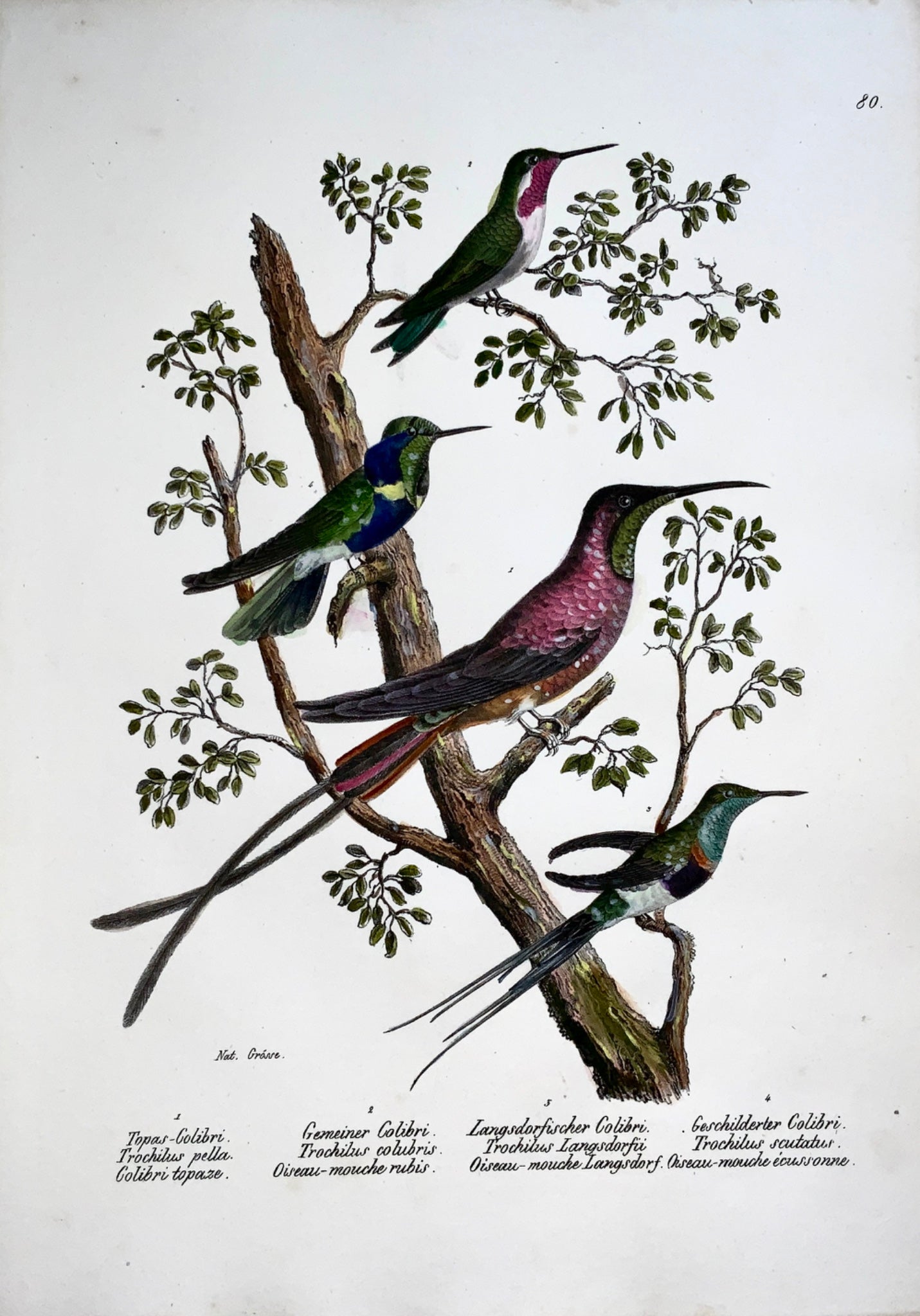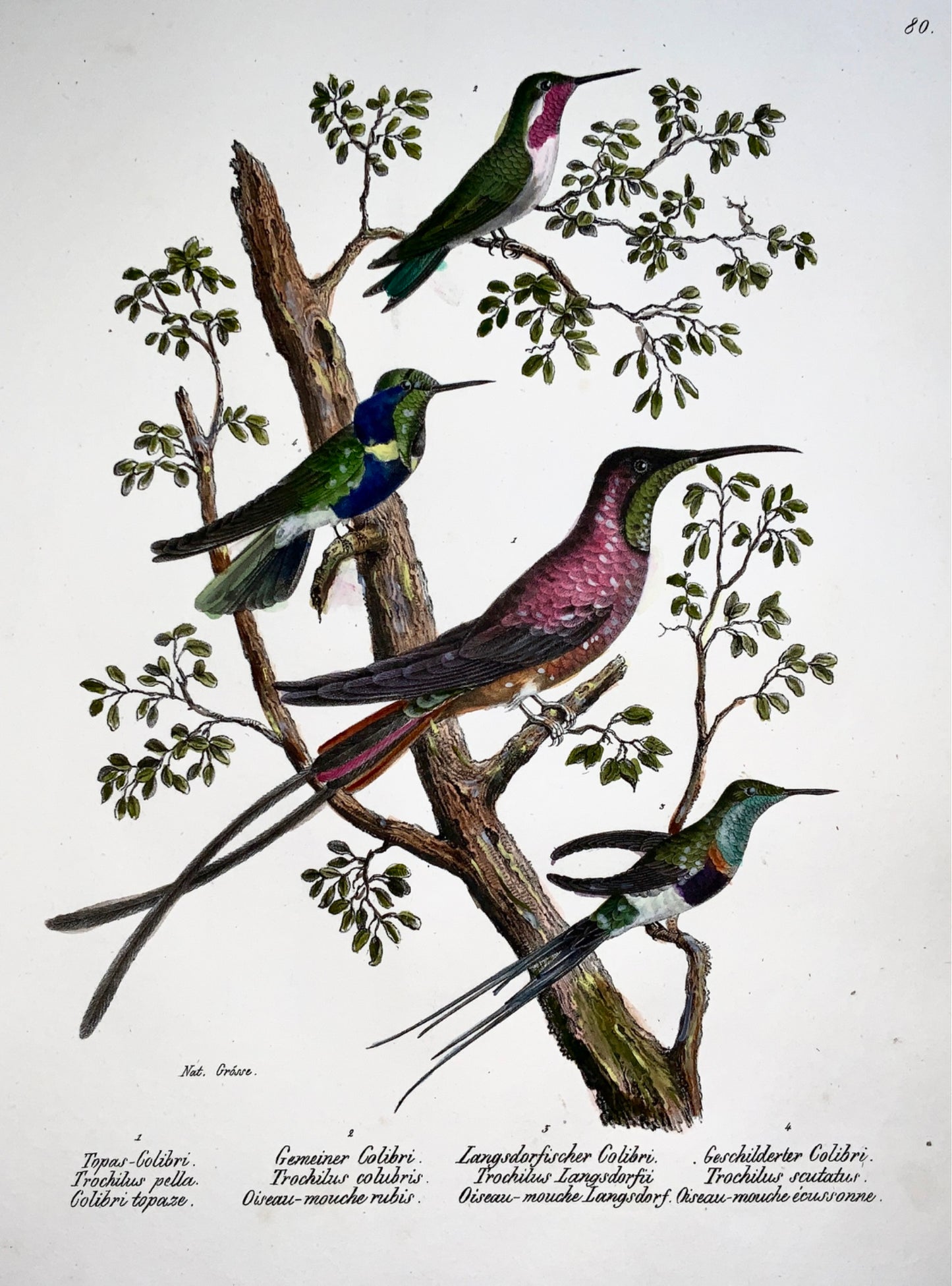 1830 COLIBRI - Ornithology - Brodtmann hand coloured FOLIO stone lithograph